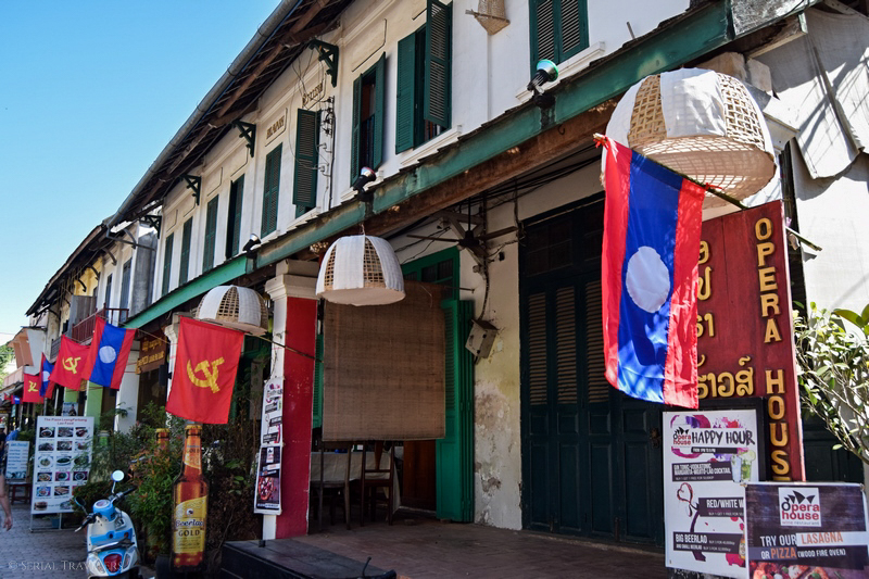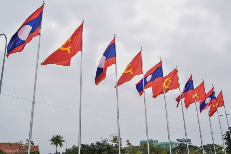 Dans de nombreuses villes, on trouve encore beaucoup de drapeaux de la Russie Soviétique à côté du drapeau laotien sur les façades des bâtiments, rappelant que le pays est avant tout socialiste, dirigé par un parti unique d’obédience marxiste-léniniste !