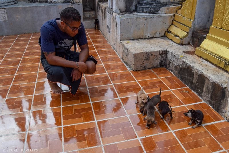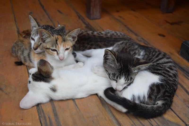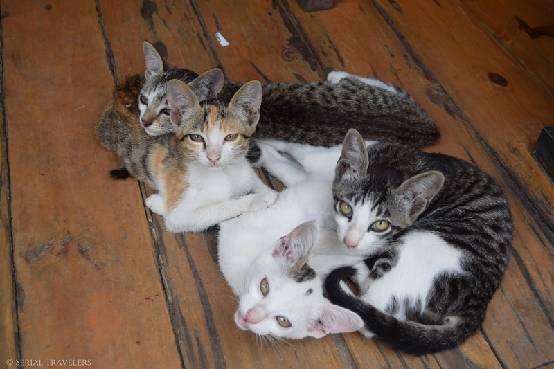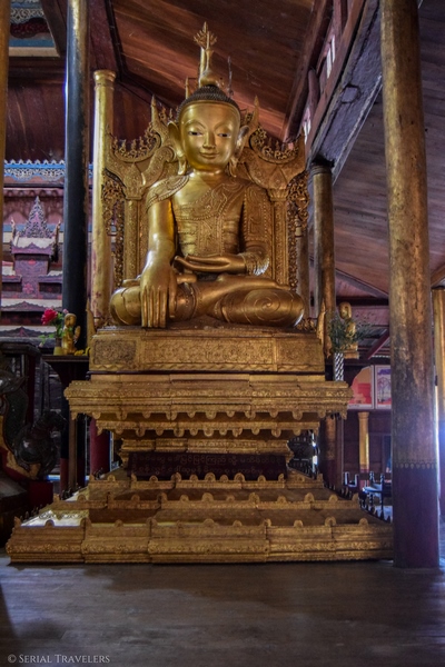 Bon, arrivés au monastère, on est un peu déçus, car il s’agit uniquement d’un bâtiment en bois sur le lac, avec quelques figures de Bouddha et quelques chats ici et là… Qui ne sautent pas du tout ! En fait, le moine qui a construit ce monastère apprenait des tours à ses chats pour amuser les touristes…