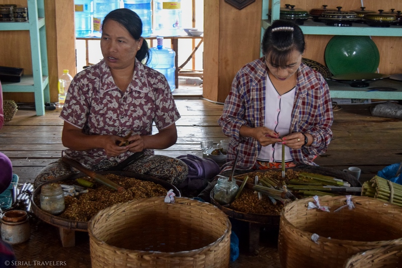 Avec la visite de l’atelier de confection de bijoux, il s’agit de notre spot préféré de la matinée ! Chez Inn Joe Phyu-Cheroot Workshop, on vous accueille dans la fumée de tabac et d’épices 🙂 Aucun de nous deux ne sommes fumeurs mais nous avons apprécié la visite car on nous a fait gratuitement goûter aux cigarettes artisanales (à la banane, à l’anis et au miel, ainsi qu’à la menthe) et on a accès au process complet de fabrication.