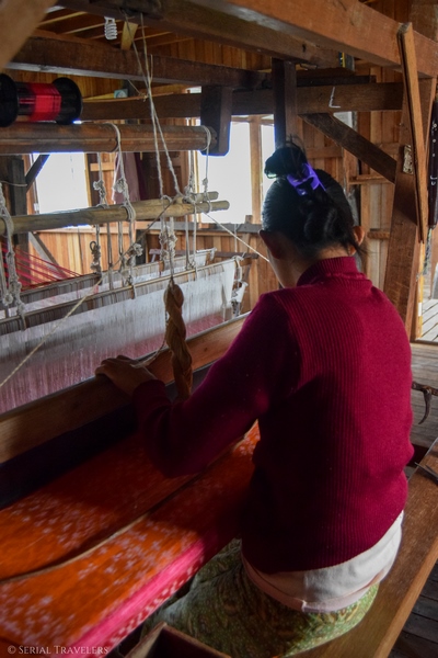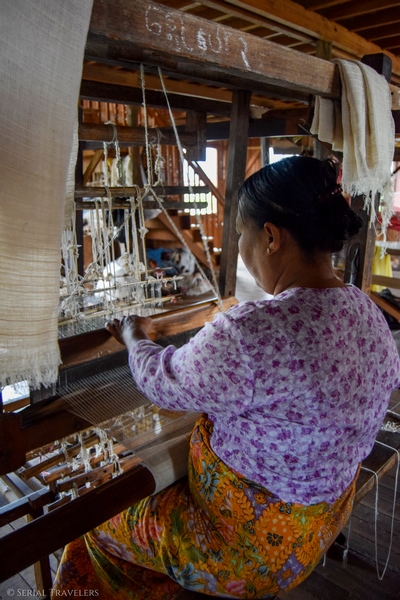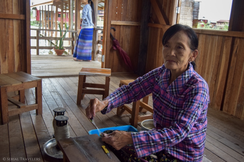 Ensuite, après avoir atteint la pointe tout au Sud du lac (proche du village de Nampan), nous atterrissons dans une fabrique de tissus, où l’on trouve plein de métiers à tisser. Mais, l’aspect le plus intéressant de la visite est qu’on nous montre comment on crée un tissu à partir d’une tige de lotus ! Eh oui, en cassant la tige, on obtient une sorte de soie végétale que les ouvrières roule pour réaliser une bobine ! Vraiment impressionnant !