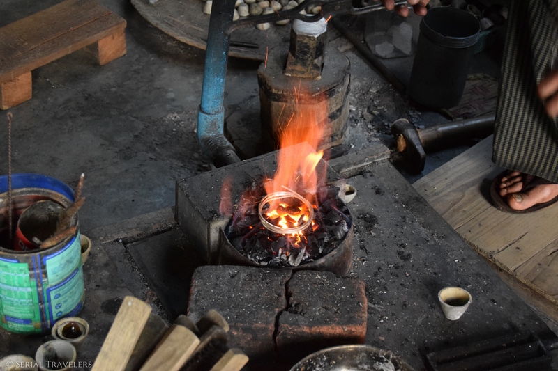 Nous démarrons la journée par la visite d’un atelier de confection de bijoux en argent, situé au Sud du lac : Ngwe Kyar Phyu – Silver traditional showroom. Pendant une dizaine de minutes, une hôtesse nous explique comment l’argent est extrait de la roche dans une région du Myanmar (on ne s’en souvient plus malheureusement), fondu dans un creuset et travaillé sur place.