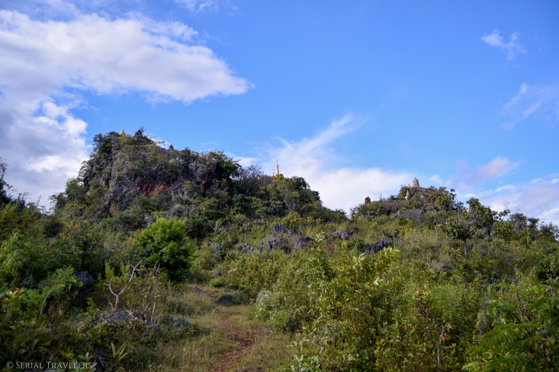 On suivra d’abord une mauvaise piste en se rendant au sommet d’une colline où trônaient des pagodes dorées que l’on observait depuis le bas. Arrivés en haut, il n’y a pas grand chose à voir, mais on a quand même droit à un sacré panorama et on peut enfin apercevoir le temple d’Inn Dein !