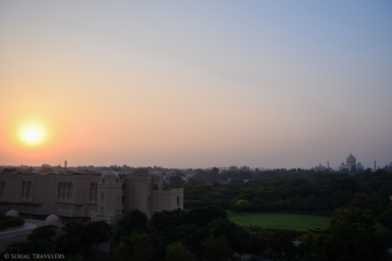 Malheureusement, le soleil ne se couche pas directement sur le Taj Mahal : on ne profite donc que très peu des couleurs descendantes de la fin de journée. Toutefois, cela reste un moment magique, où nous admirons cette merveille pour la première fois de loin.