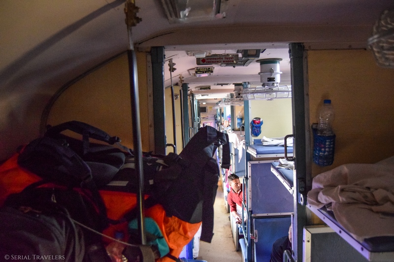 Notre train arrive en gare de Delhi à 10H30 avec 15 minutes de retard, mais ayant parcouru 1000 km avant depuis Jammu, ce retard est tout à fait compréhensible. Voire même excusable, notre second train aura 14 heures de retard ! Nous décidons de monter à bord du wagon indiqué pour Laura et tomberont sur une famille d’Indiens super sympas, nous indiquant qu’on peut rester là et qu’ils s’arrangeront plus tard avec les contrôleurs ! En effet, on ne s’attendait pas à ça, mais le wagon est un sleeper class, c’est-à-dire composé uniquement de couchettes, sans fauteuil. Vous noterez la place de Laura, située en hauteur (upper side), d’où a été prise la photo 🙂