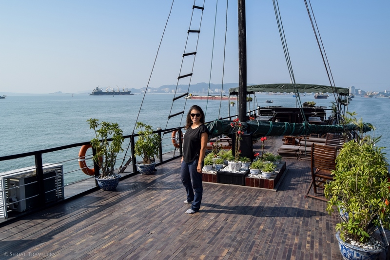 À peine sortis du minibus, nous sommes pris en charge par la responsable de la croisière qui supervisera le déroulement de notre séjour sur la jonque durant ces deux jours, malgré un anglais assez approximatif… Nous embarquons donc joyeusement sur le Garden Bay, qui ne comptera que 14 passagers à bord pour cette croisière 🙂