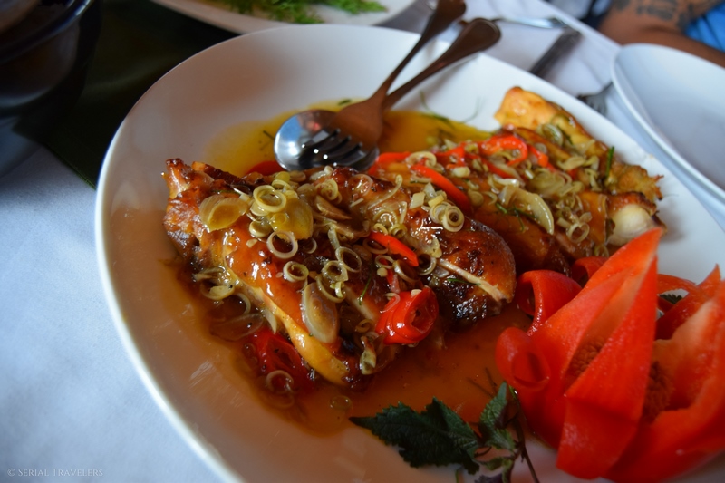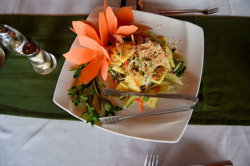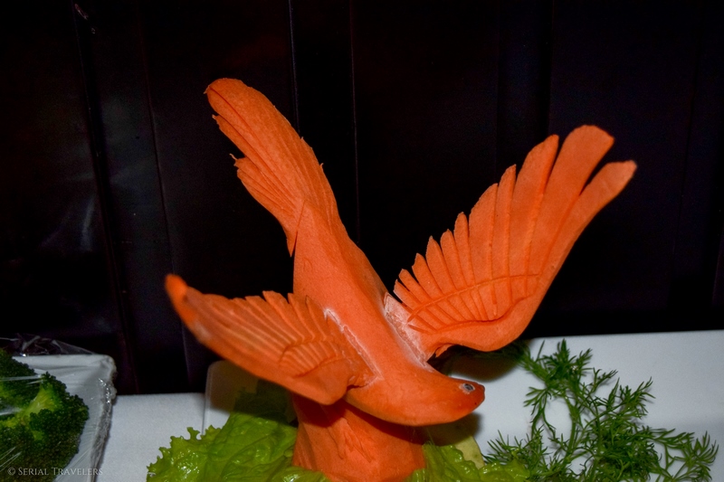Passées la découverte et l’installation dans la cabine, nous aurons droit à un repas très raffiné avec les pains de sucre en toile de fond… C’est cher donc, mais à la hauteur des prestations affichées !