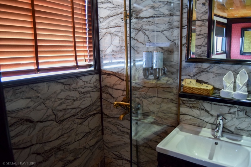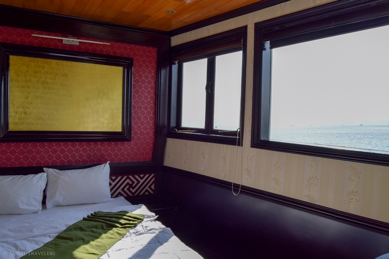 Arrivés dans notre cabine, nous sommes agréablement surpris par le confort et le luxe de la cabine, tout à fait conformes à la description qui nous avait été donnée par Bishnu de l’agence Sinh Travel Café à Hanoï ! Boiseries, salle de bain en marbre et même climatisation (bien inutile par ce froid, on en convient) font notre bonheur 🙂