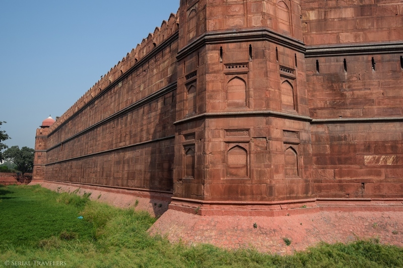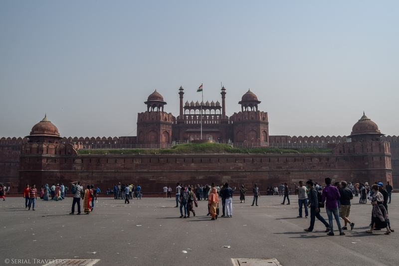 Puis, le fort rouge se dessine peu à peu à l’horizon avec ses hautes murailles (bien que la pollution de l’air omniprésente empêche de faire de belles photos, le ciel n’étant jamais bleu)… Comme la mosquée Jama Masjid, il tient son nom du grès rouge dans lequel il a été entièrement construit, entre 1636 et 1648 par l’empereur Shah Jahân (décidément il aura fait construire un paquet d’édifices celui-là) pour servir de forteresse.