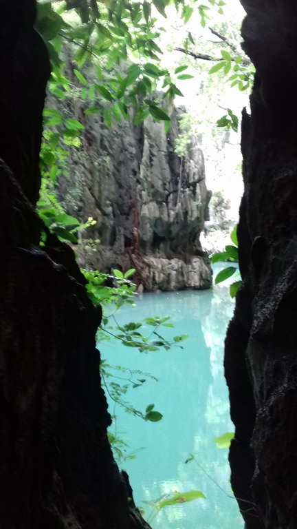 Mais le plus intéressant se trouve au bout du dédale tortueux : on tombe sur un trou dans la falaise, donnant un point de vue sur un lagon à l’eau d’un vert incroyable !