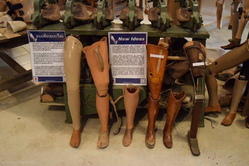 Suite à la visite du Patuxai, nous partons en direction du COPE Center en tuktuk. Ce centre est la vitrine d’une ONG laotienne qui aide au démantèlement des bombes disséminées dans tout le pays, ainsi qu’à l’aide matérielle aux victimes collatérales (fabrication de prothèses). En effet, et on l’apprendra grâce à l’exposition permanente du COPE Center, le Laos est le pays qui a été le plus sévèrement touché par les bombardements américains pendant la guerre du Vietnam…