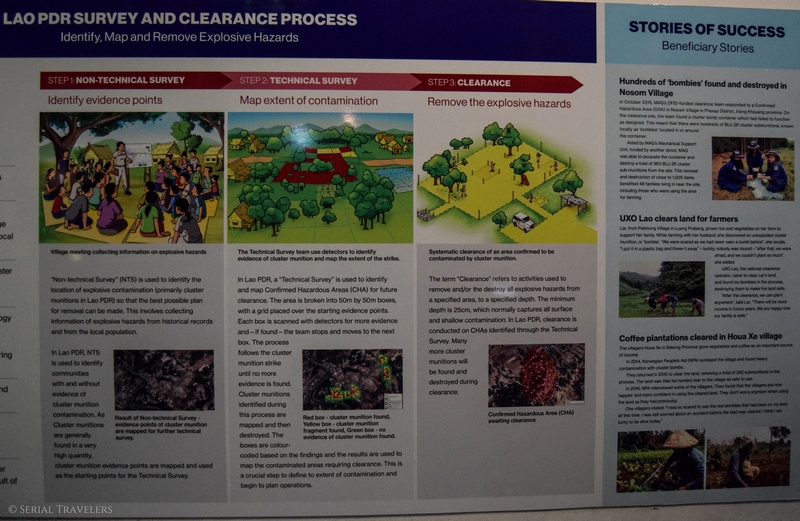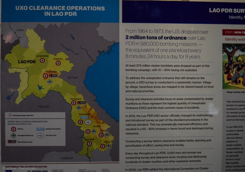 Or, on estime que 10 à 30% de ces bombes n’ont pas explosé (UXO pour UneXploded Ordnance, littéralement munitions non explosées)… Au cours d’un film présenté pendant la visite, on apprendra que beaucoup d’enfants essaient de récupérer le métal de ces engins de mort pour rapporter un peu d’argent à leurs familles et que souvent, cela se termine mal, on vous passe les détails…
