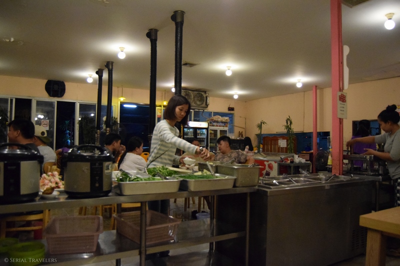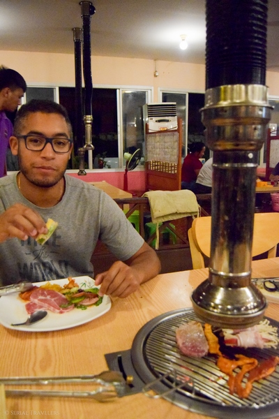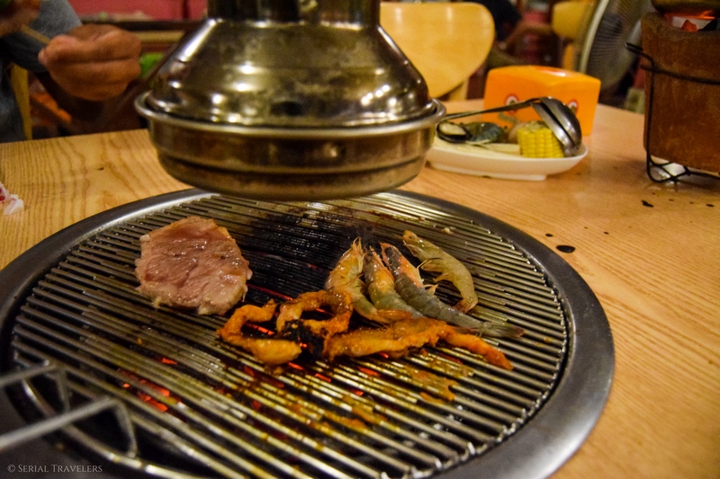 La dernière fois que nous avions mangé coréen, c’était à Malacca et ça avait mal fini (gros mal de ventre pendant la nuit)… On a décidé de conjurer le sort et avons testé un buffet coréen au restaurant Kimji Ne. Vous vous servez et faites cuire vos aliments sur une grille de barbecue au dessus du charbon en fusion au milieu de votre table.