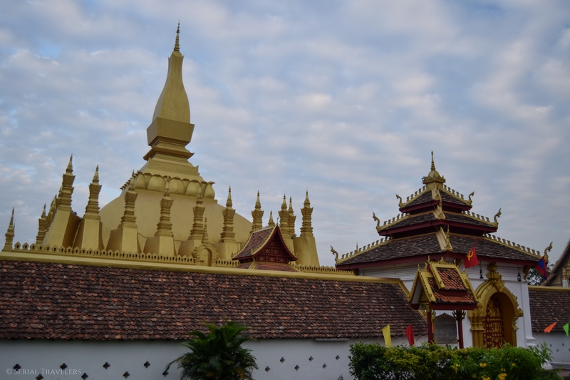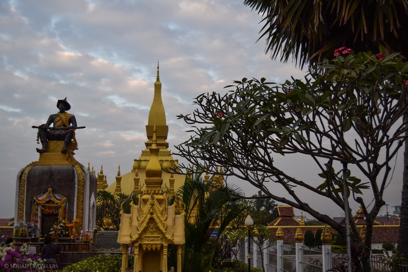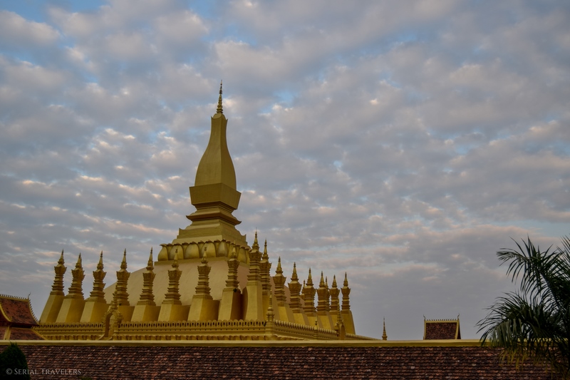 En sortant du COPE Center, le temps gris qui ne nous avait pas lâché de la journée se décide enfin à laisser transparaître un peu de ciel bleu… que nous pourrons peut-être exploiter pour le coucher de soleil sur le temple de That Luang. Par fainéantise, on reprend donc un tuktuk avec qui nous négocions une attente de 30 minutes sur place le temps qu’on fasse le tour des lieux et le retour vers la guesthouse.