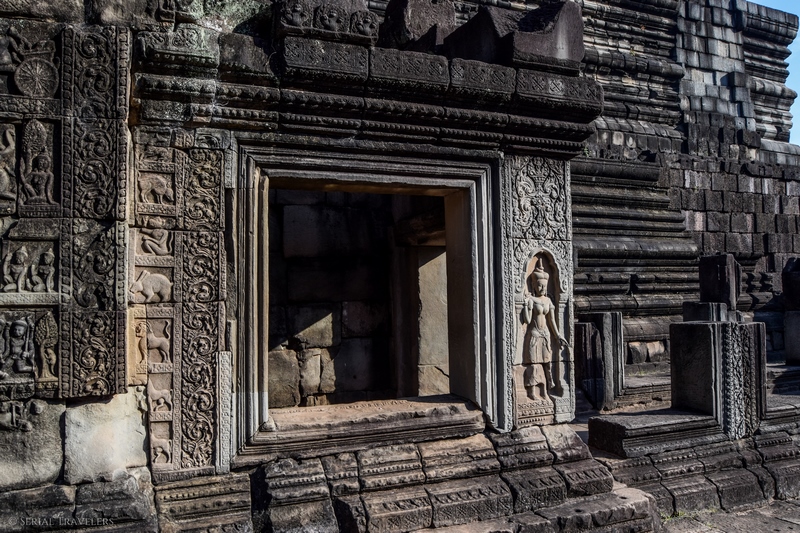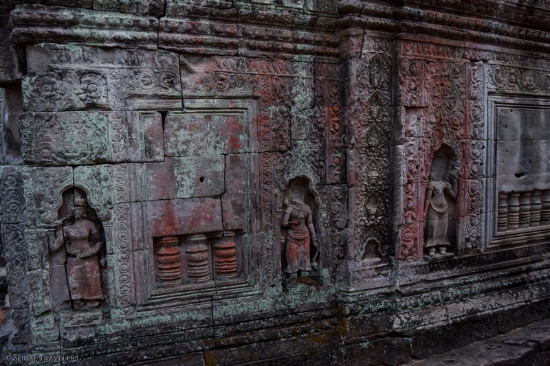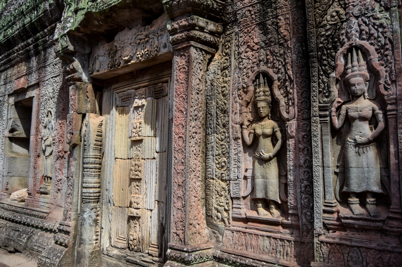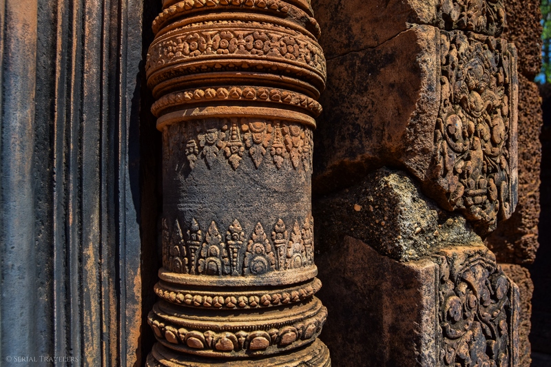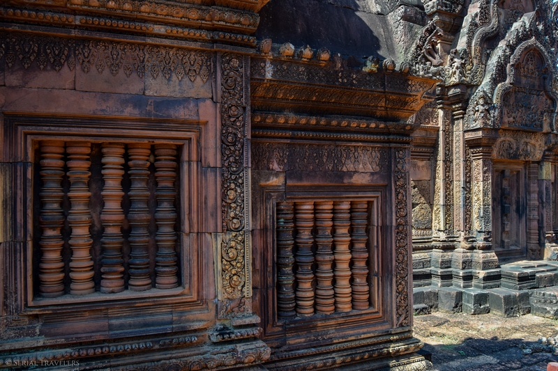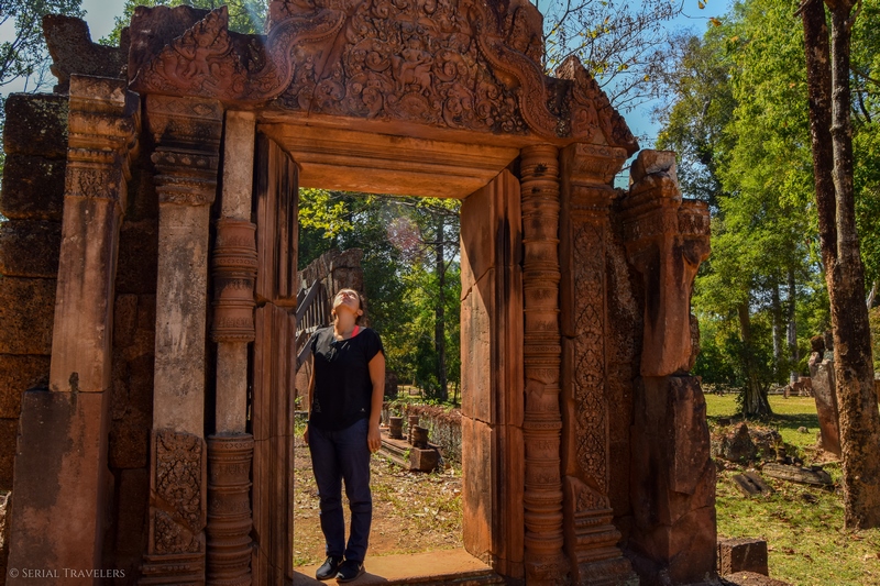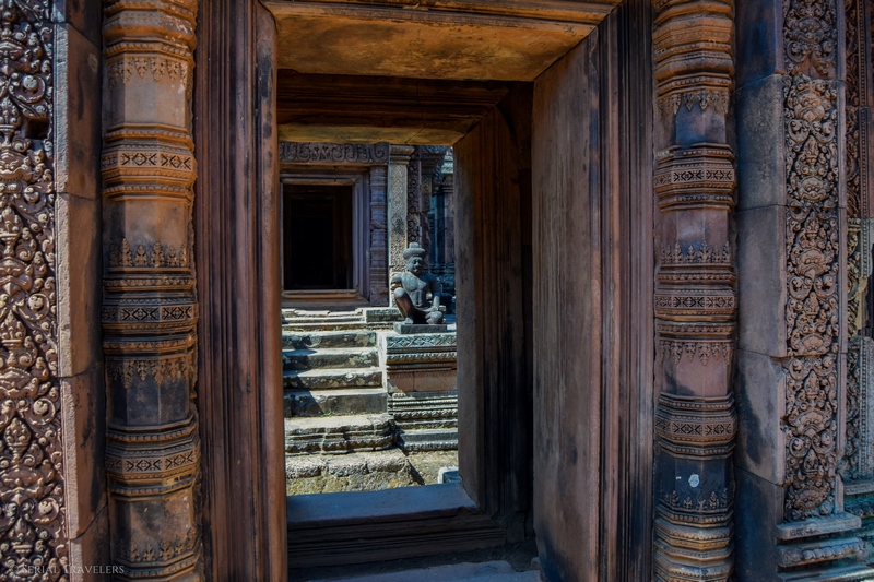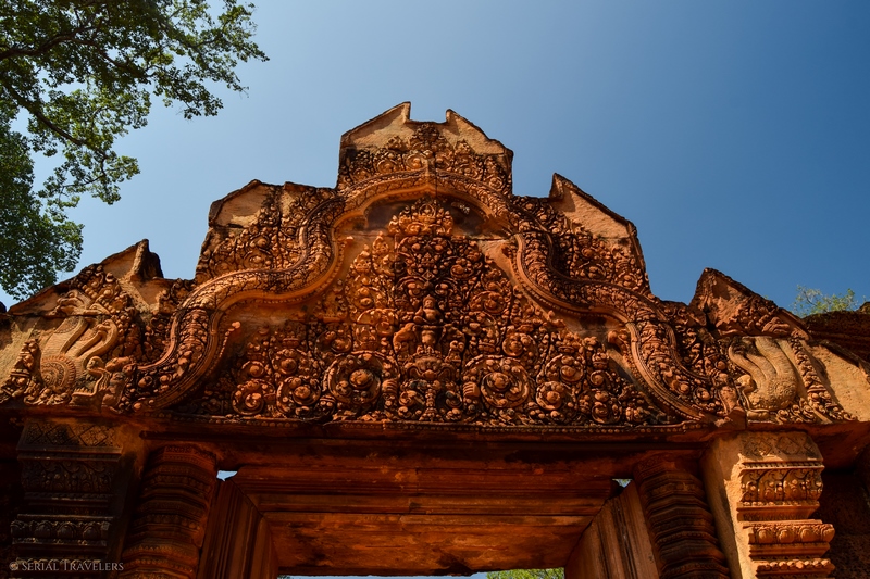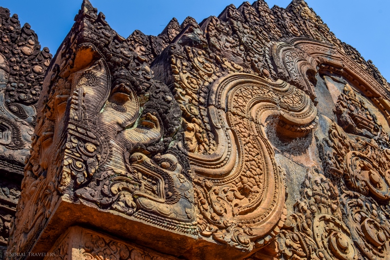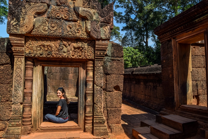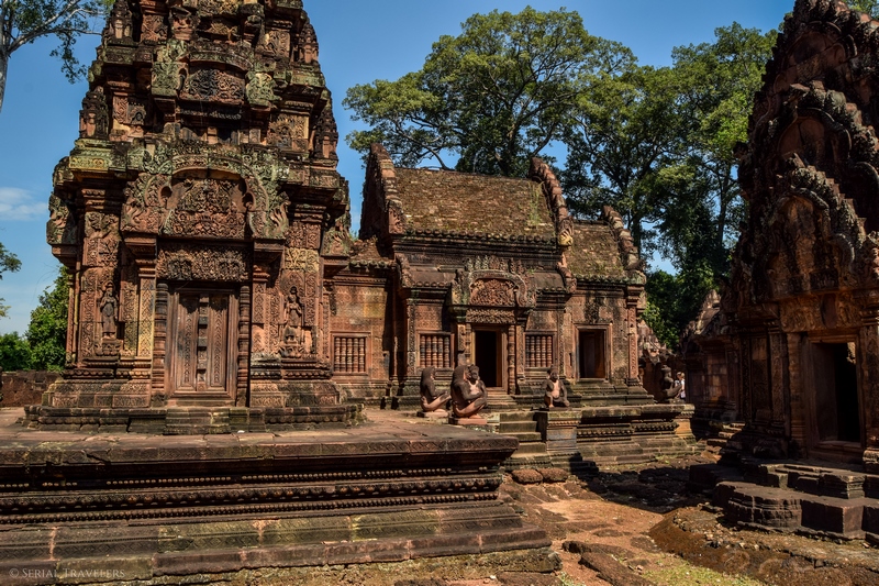 Les archéologues pensent alors que seules des femmes ont pu avoir assez de raffinement pour effectuer cette tâche délicate ! La deuxième particularité de ce temple est qu’à contrario des autres temples angkoriens, celui-là a été construit dans du grès rose. En fonction de l’orientation du soleil, la pierre peut virer du rose au rouge en passant par l’orange 🙂