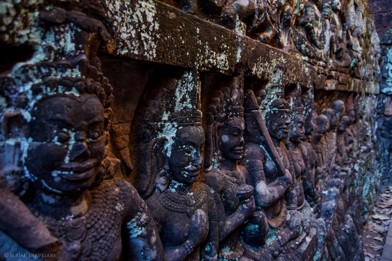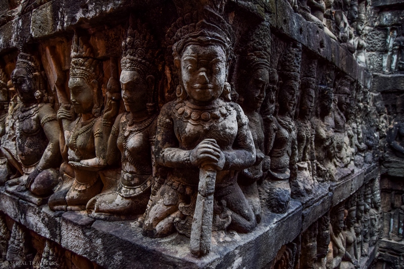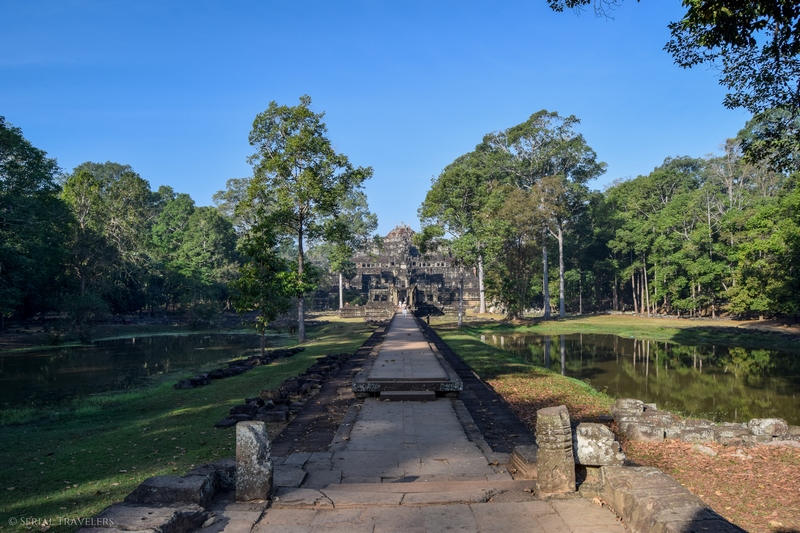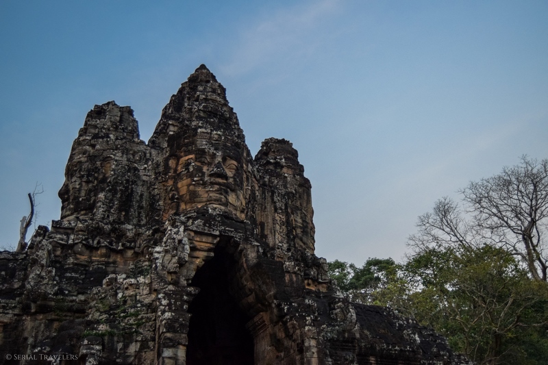 Nous enchaînerons ensuite les temples situés dans l’enceinte d’Angkor Thom, une véritable ville fortifiée, qui contient plusieurs temples, dont le fameux Bayon. Ankgor Thom a la particularité de présenter à chaque entrée une porte surmontée d’une arche avec 4 visages de Bouddha gigantesques. On trouve également un pont franchissant les douves, sur lequel on retrouve 54 statues tirant sur un naga sacré : il s’agit de la célèbre scène du barattage de la mer de lait !