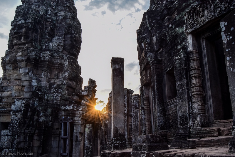Coucher de soleil sur le Bayon et depuis la porte Sud d’Angkor Thom