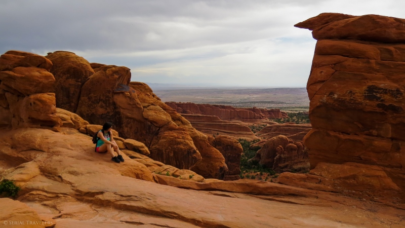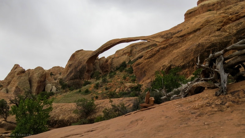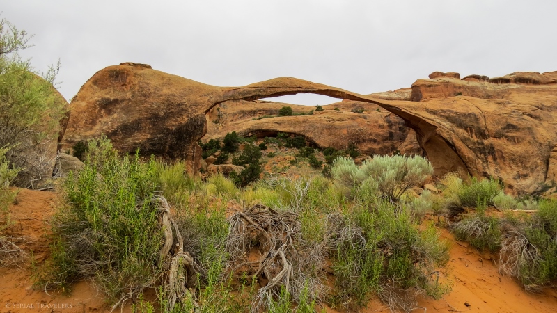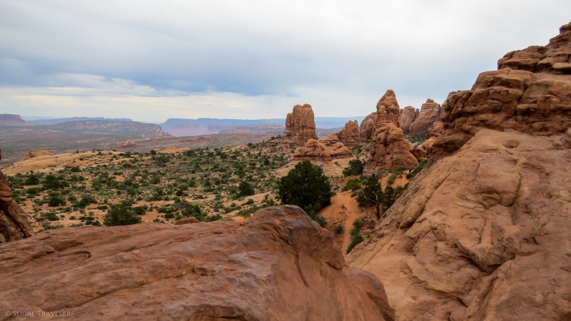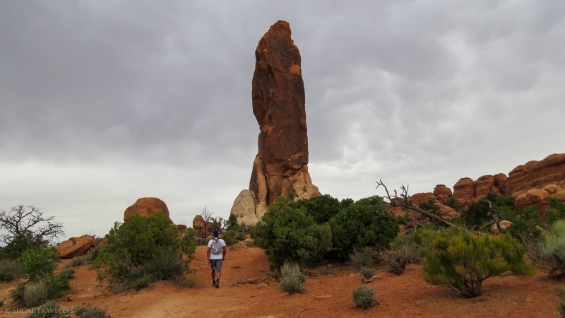Passé Landscape Arch, le sentier devient plus technique et s’apparente quasiment à de l’escalade pour passer les langues de roche ! Nous ferons un petit détour jusqu’à Navajo Arch, avant d’arriver à Double O Arch, 2 arches formant des « O » quasi parfaits ! La pluie arrivant, on pousse assez difficilement jusqu’à Dark Angel, une grande obélisque naturelle. C’est ici que nous déciderons de rebrousser chemin pour revenir au parking vers 11H. Sur le chemin du retour, nous passons devant Partition Arch, qui permet d’apercevoir un beau panorama du parc à travers l’arche.