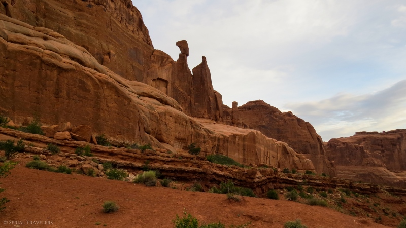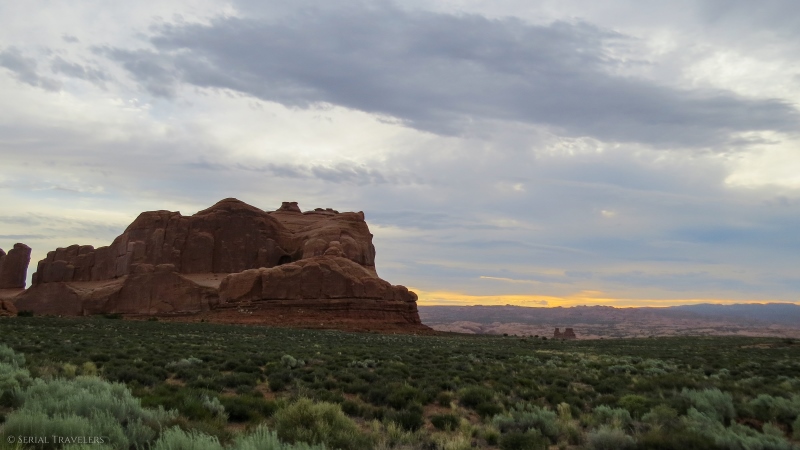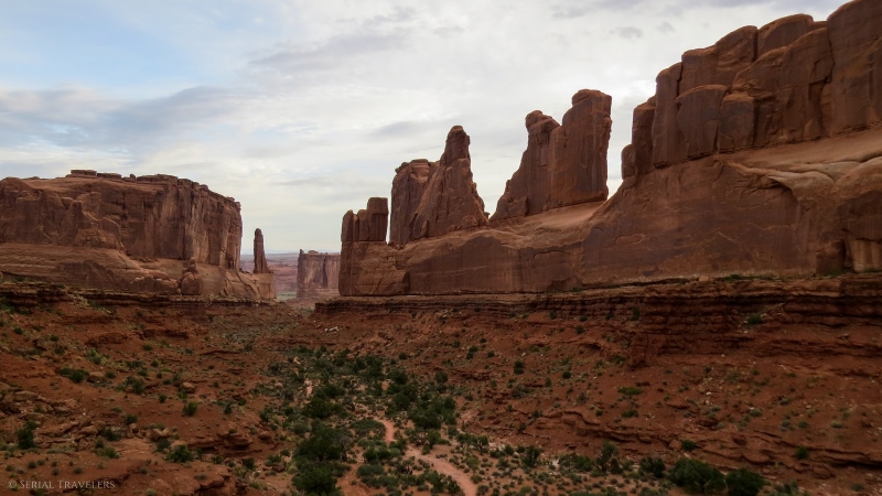 Nous devons donc nous lever très tôt ce matin pour sortir de Moab, afin de rejoindre le parc le plus tôt possible. Nous arriverons au niveau de l’entrée d’Arches National Park un peu avant 6H45, sous une météo maussade… À l’arrivée dans le parc, nous empruntons une route sinueuse qui serpente et monte en lacets pour arriver sur un plateau. Le plateau débouche ainsi sur les immenses murs de roche rouge de Park Avenue, le premier arrêt dans le parc. Ce défilé rappelle en effet l’alignement des célèbres buildings de New York !
