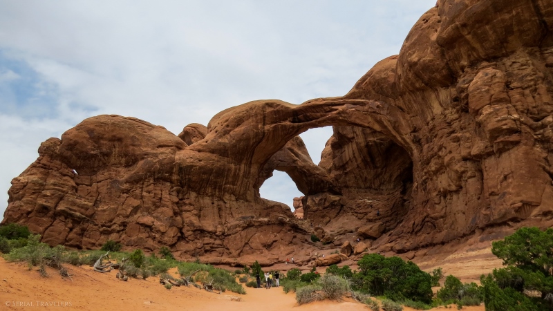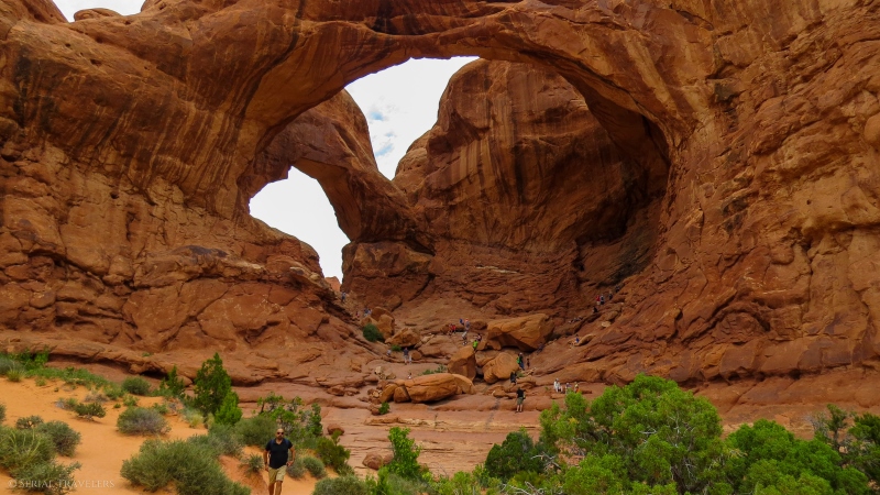 Nous démarrons par le Double Arch Trailhead, qui permet d’atteindre 2 arches massives reliées entre elles, car creusées dans le même amas rocheux. Pour l’anecdote, cette arche double est visible au début du film Indiana Jones et la Dernière Croisade 🙂