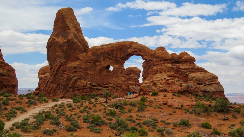 Sur le retour, en repassant par le parking, Laura préférera se reposer et faire une sieste dans la voiture, plutôt que d’entamer la deuxième randonnée du coin. Effectivement, le réveil matinal et le trek du matin commencent à se faire ressentir pour tous les deux. Thomas sera donc le seul courageux sur ce deuxième sentier de randonnée des Windows 🙂 Le Windows Trailhead donne accès aux 2 grandes arches de North et South Windows ainsi qu’à Turret Arch, 2 arches creusées dans un bloc aux formes particulières !