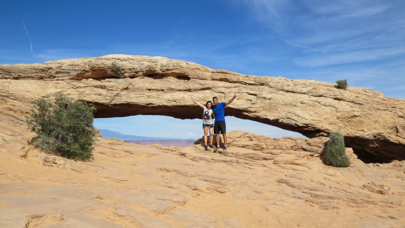 À la fin du trek du Murphy Point Overlook, il n’est que 16H. Étant donné que nous avons terminé cette randonnée plus rapidement que prévu, nous décidons de retourner voir la Mesa Arch, dans l’espoir d’avoir plus de latitude que ce matin pour faire nos photos. Et cet après-midi, les randonneurs semblent enfin plus civilisés, puisque chacun leur tour, ils passent devant l’arche, se prennent et photo et repartent ensuite. Nous aurons donc la chance de faire une série de photos plus sympas que le matin, disposant d’une lumière plus chaude 🙂