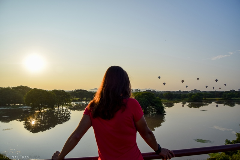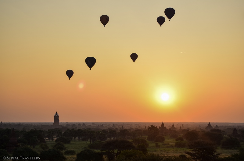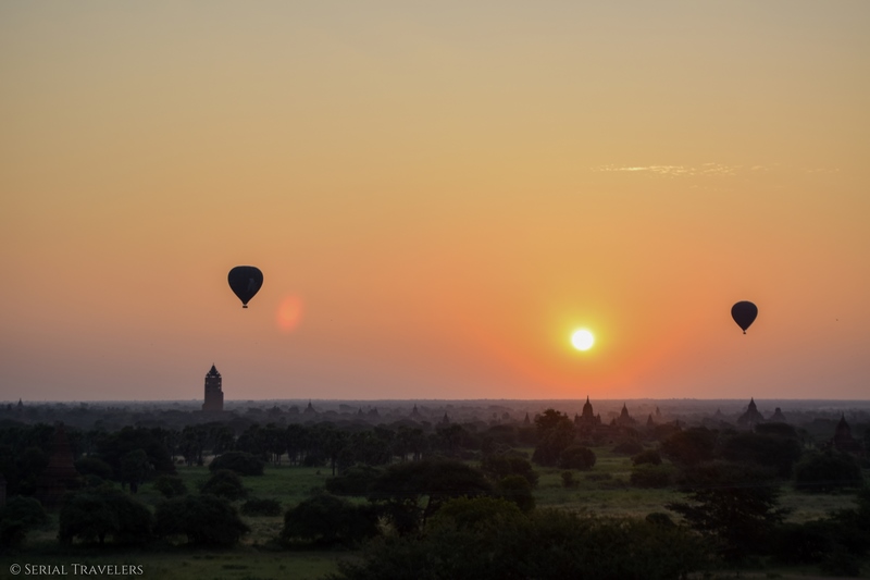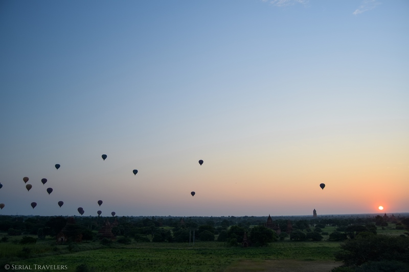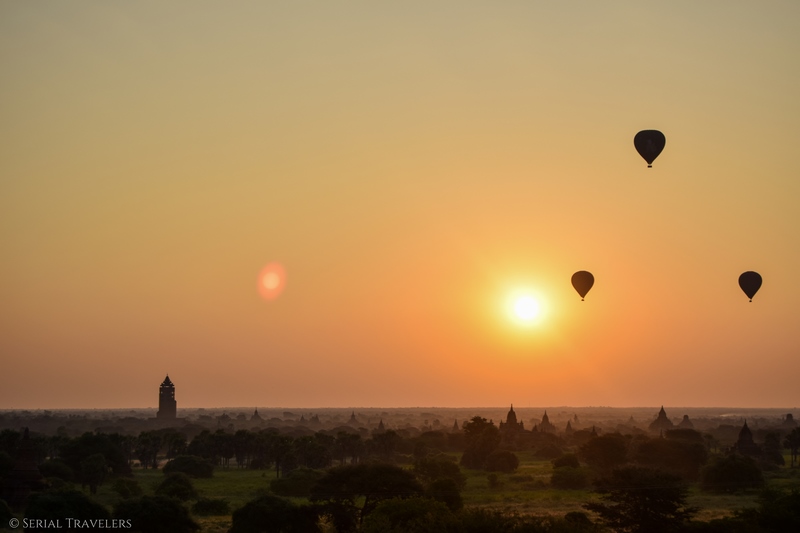 Le spectacle est vraiment magique lorsque le soleil monte et que les ballons suivent sa course : le ciel s’embrase dans des tons jaunes orangés, donnant un caractère mystique à la scène ! Voici l’image de Bagan que nous étions venu chercher !