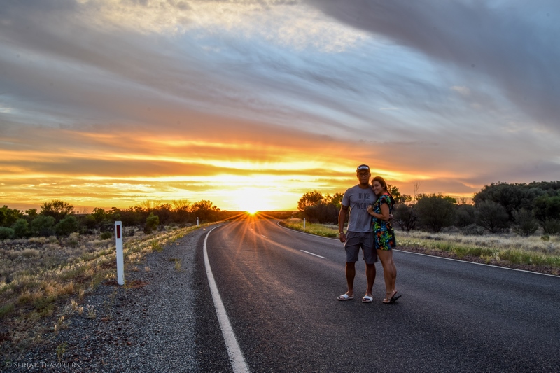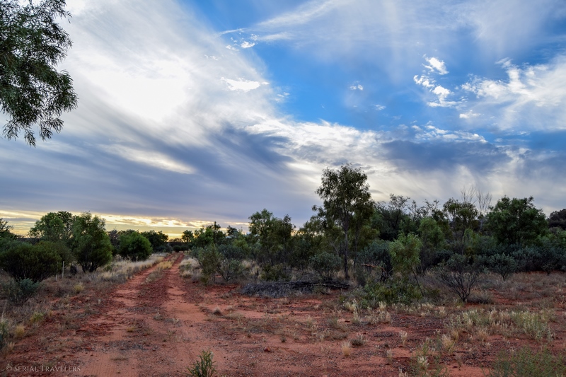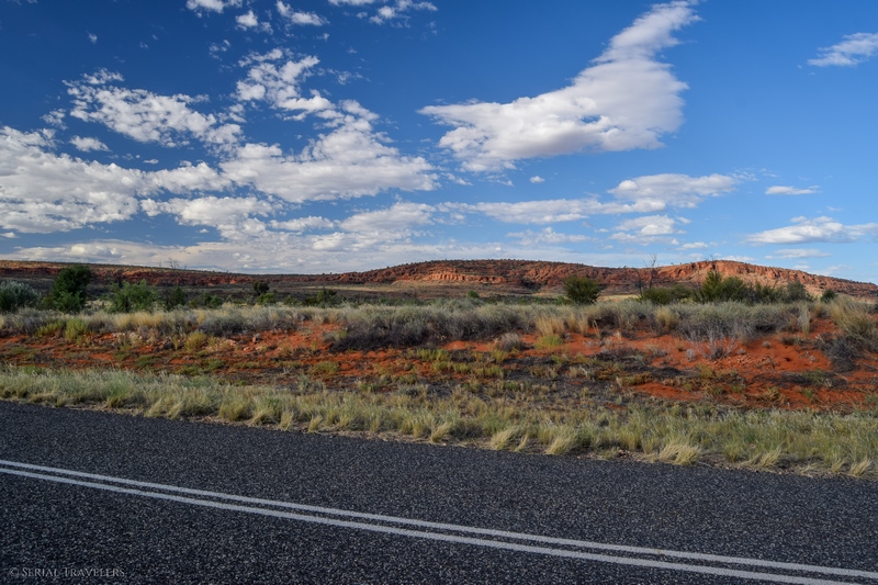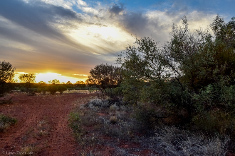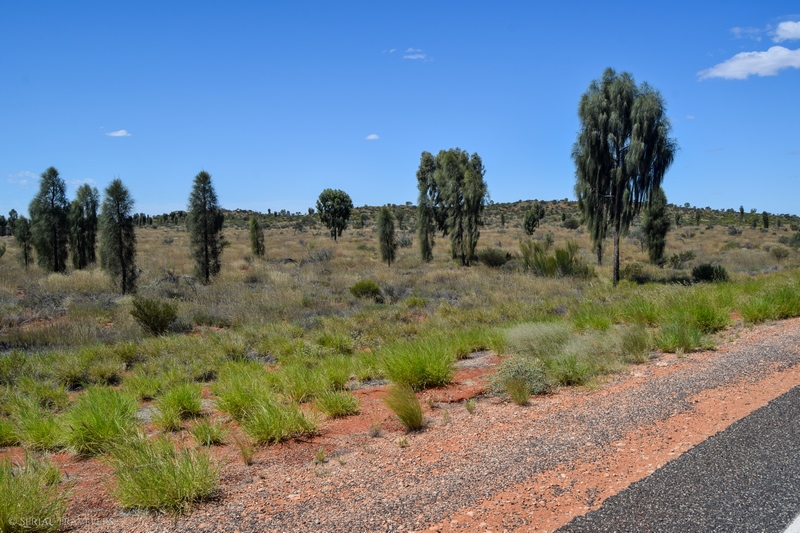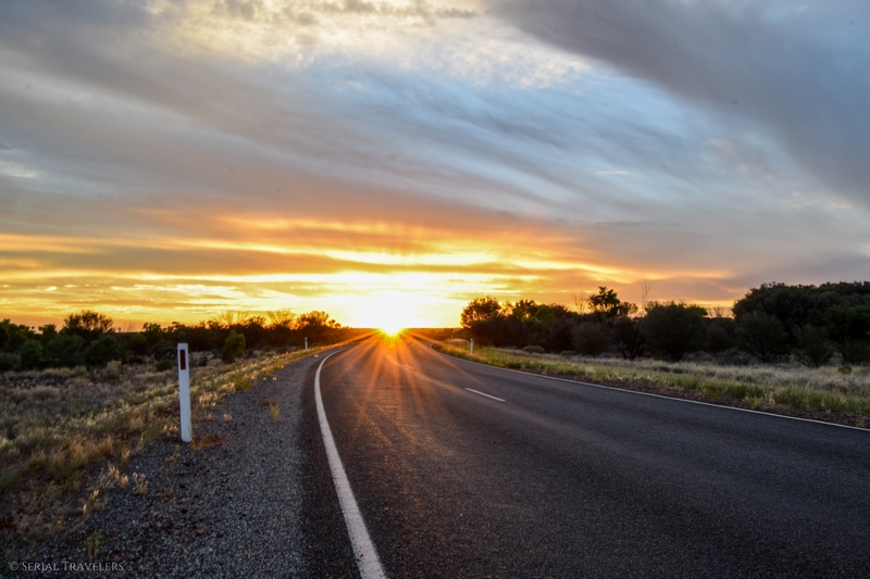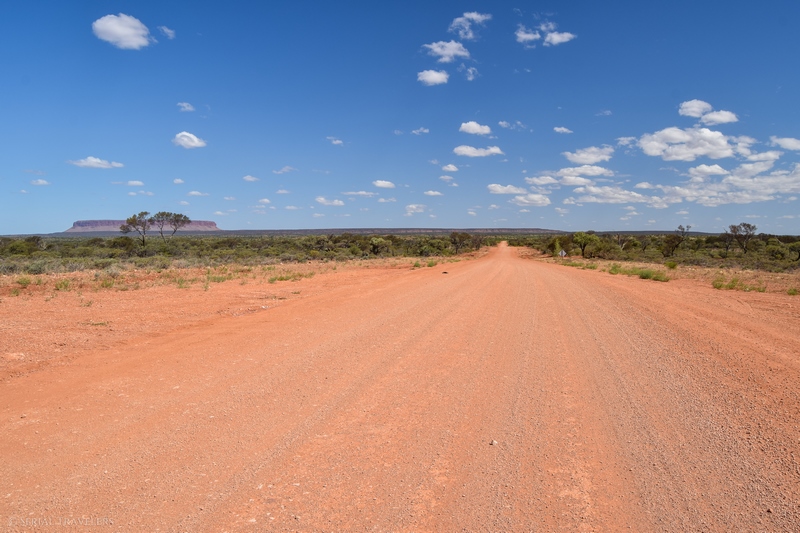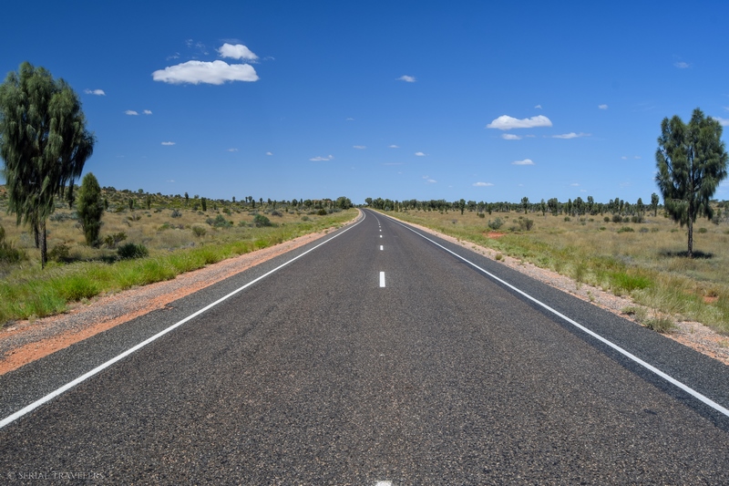 Vers 17H, après avoir roulé pendant près de 3 heures non-stop en ayant croisé moins de 10 voitures, nous arriverons enfin au niveau du parc national de Watarrka ! Et ici, on se rend bien compte de l’immensité vide d’hommes de l’Australie : la route monotone, seulement quelques véhicules croisés, et pas un seul animal au compteur… D’ailleurs, les quelques automobilistes que nous croiserons dans l’Outback font pratiquement tous un salut aux autres véhicules croisés, ce qui permet un peu d’atténuer ce sentiment de solitude…