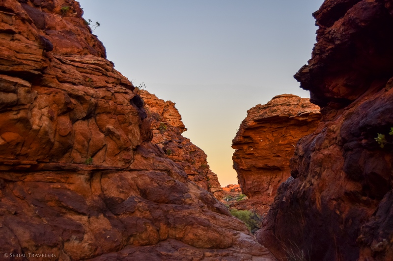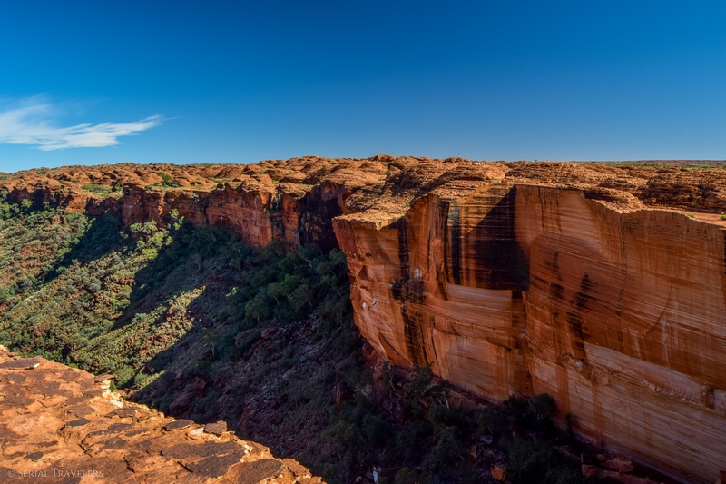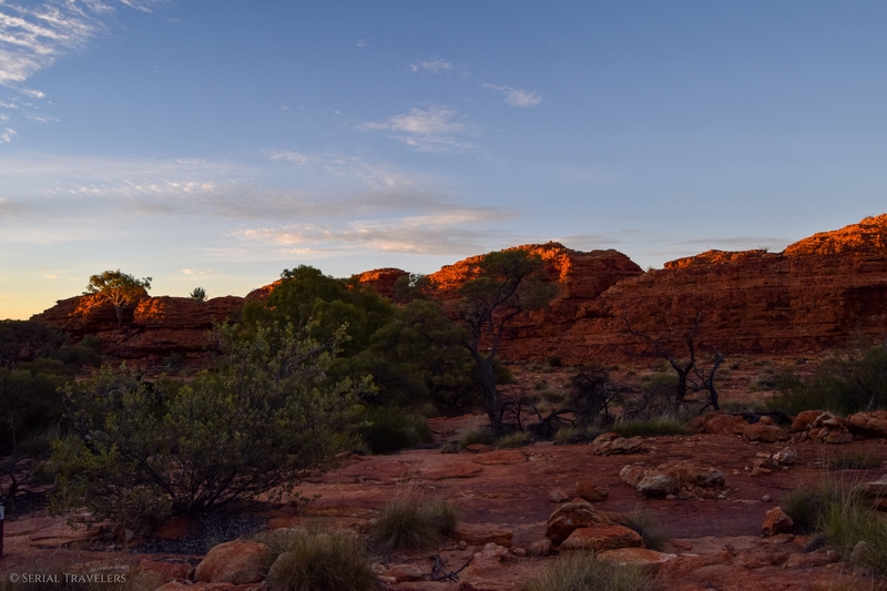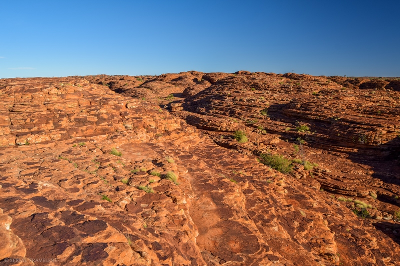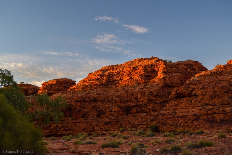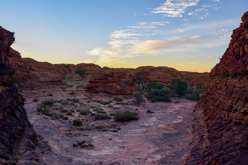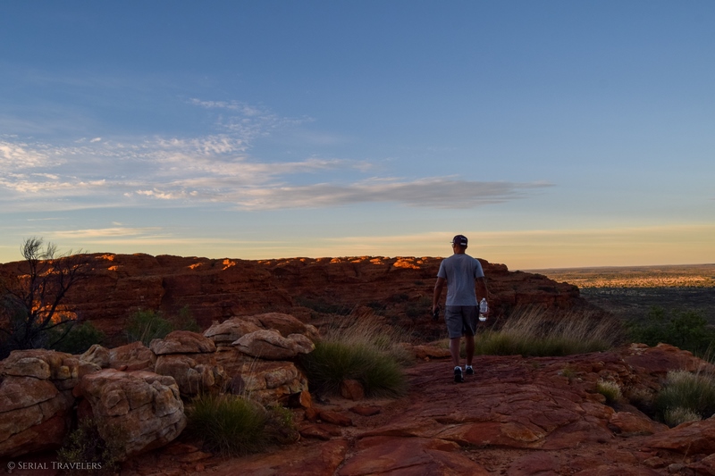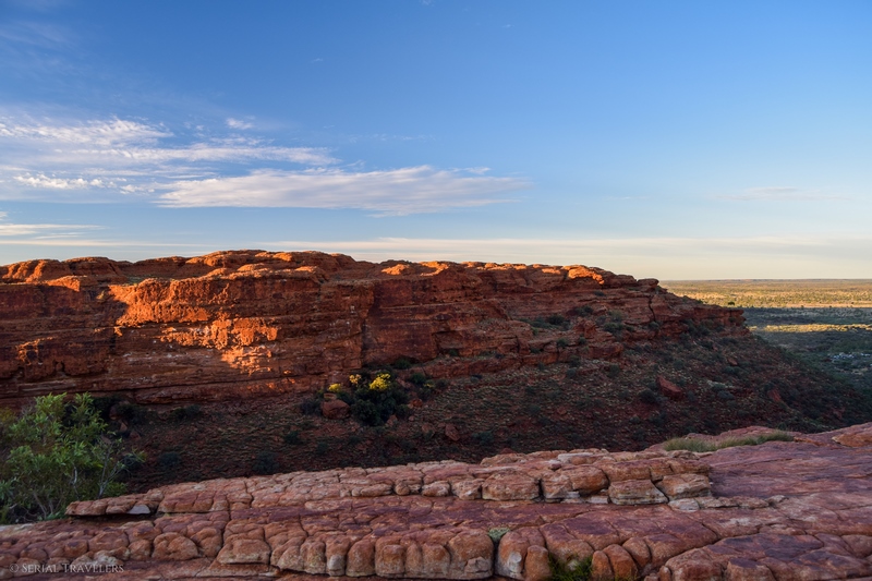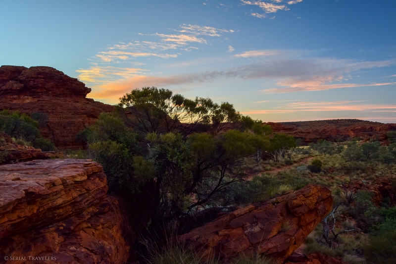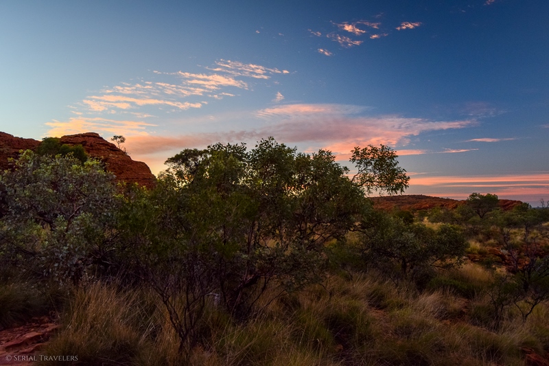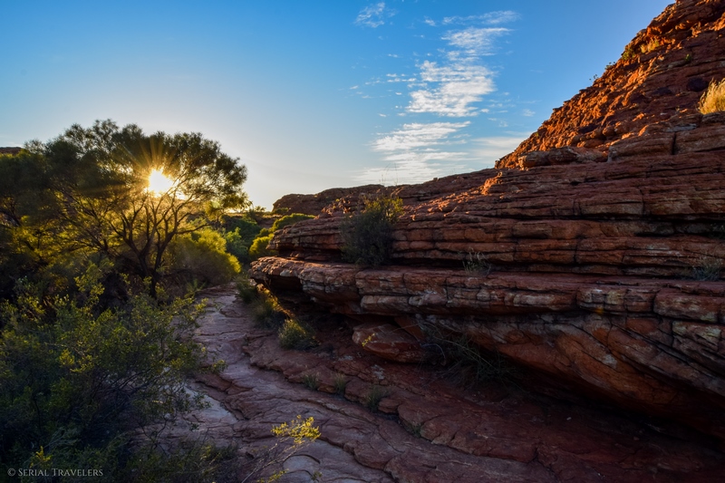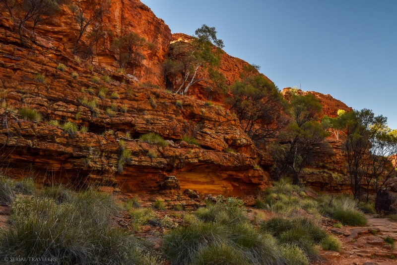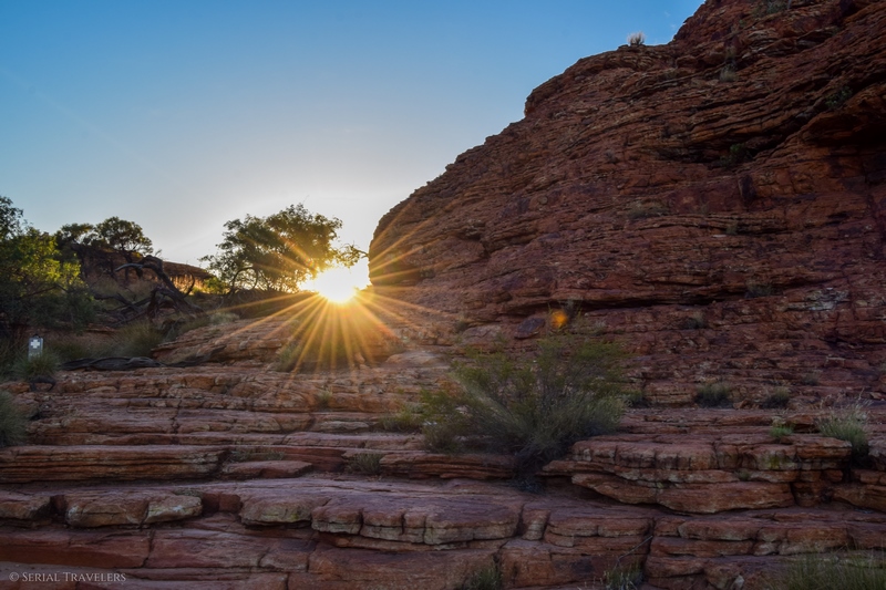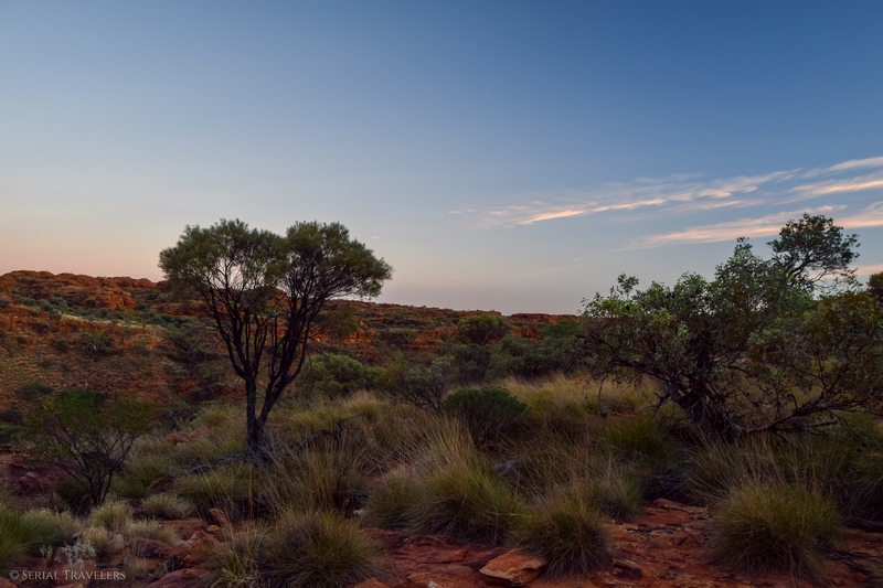 - Contrairement à ce qu’il nous a été dit par plusieurs touristes, le sentier de la Kings Canyon Rim Walk est encore ouvert après 11H du matin, mais il serait dommage de rater le lever de soleil sur le canyon. Pensez toutefois à prendre beaucoup d’eau si vous attaquez le sentier en plein après-midi !