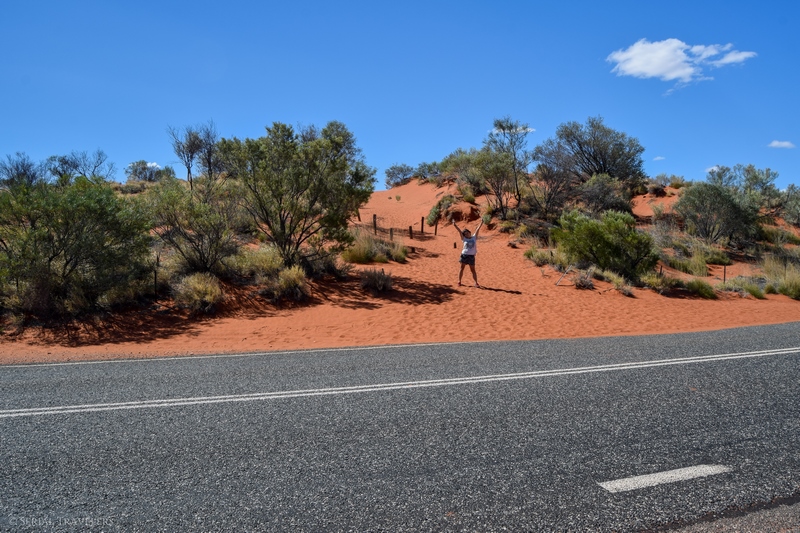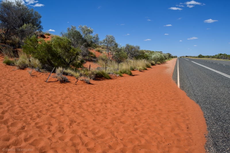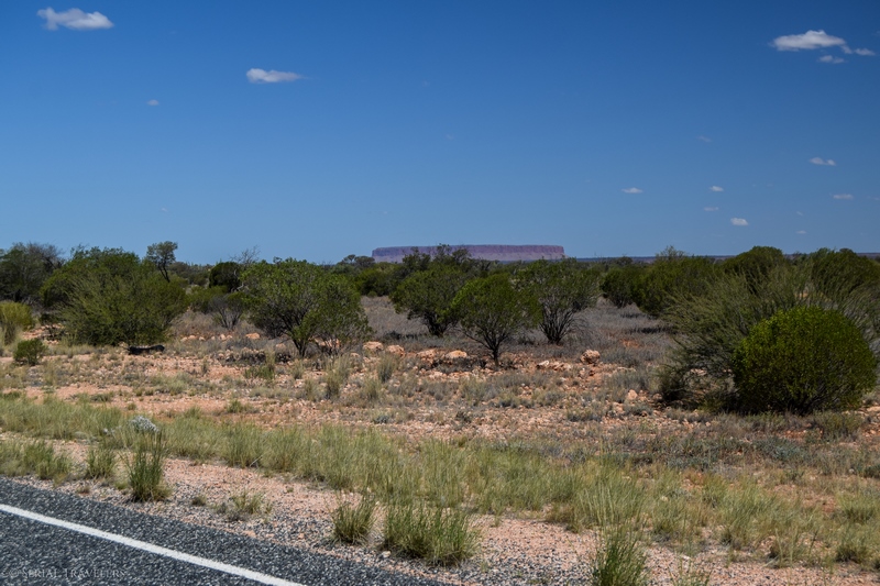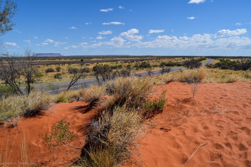 Après avoir arpenté la côte Sud-Est de l’Australie pendant deux semaines, nous voilà maintenant en plein milieu de l’Outback, au milieu de rien, 1H30 seulement après notre descente de l’avion ! D’ailleurs, l’Outback n’a pas de définition ni de situation géographique précises, mais on considère qu’ils s’agit de l’arrière-pays semi-aride de l’Australie, situé au-delà du bush. Vers 14H donc, nous prenons le volant en direction du Nord, pour espérer rejoindre Kings Canyon en début de soirée, afin d’assister au coucher de soleil. Enfin, cette fois-ci, c’est Laura qui prendra le volant en premier, une grande première en Australie ! Et il ne faudra, pas chômer, car 300 km séparent Yulara de Kings Canyon ! Heureusement, sur la longue route serpentant dans l’Outback, on retrouve quelques curiosités qui permettent d’agrémenter le voyage…