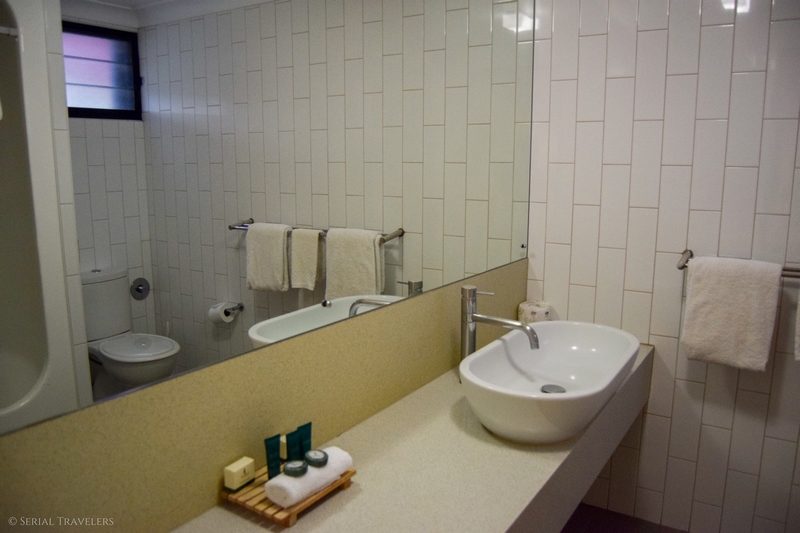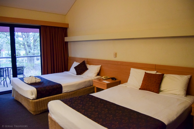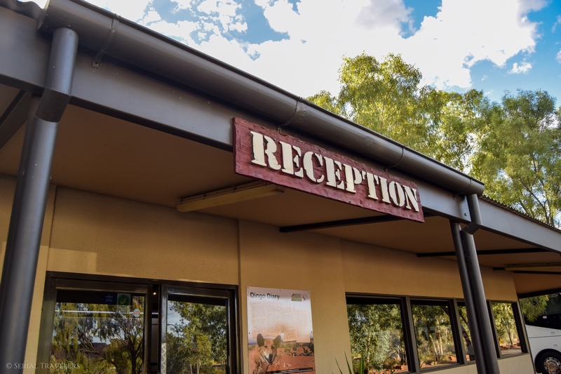 Finalement, nous arriverons au niveau de la réception du Kings Canyon Resort peu avant 18H, le seul complexe hôtelier/caravan-park/station-essence/épicerie du coin, à proximité de Kings Canyon. Les 4 heures de route annoncées ne sont donc pas de trop pour avaler les 300 km de route depuis Yulara ! À la base, nous avions prévu de séjourner dans une Budget Lodge Room (comprenez une chambre avec salle de bains commune) mais nous aurons la chance d’être surclassés en Standard Resort Rooms au moment d’effectuer le check-in 🙂