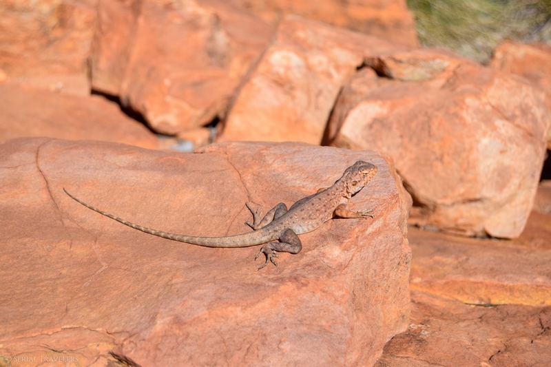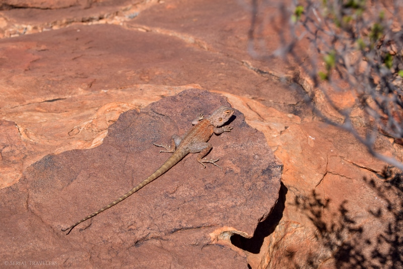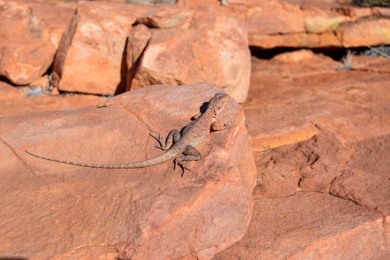 La suite de la Kings Creek Rim Walk consiste à revenir au point de départ de la randonnée, en marchant sur le versant Sud du canyon, d’où la vue est toute aussi jolie et impressionnante. Et, avec beaucoup de chance, nous aurons même l’occasion de prendre en photo un lézard, pas farouche du tout ! Si vous êtes vraiment très chanceux, vous aurez peut-être le privilège d’observer les wallabies et kangourous qui peuplent la région 🙂