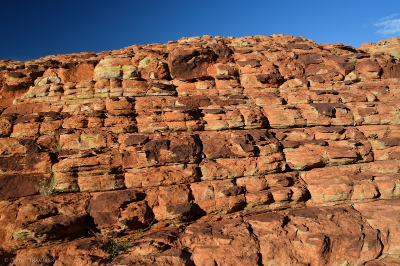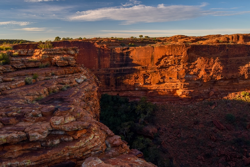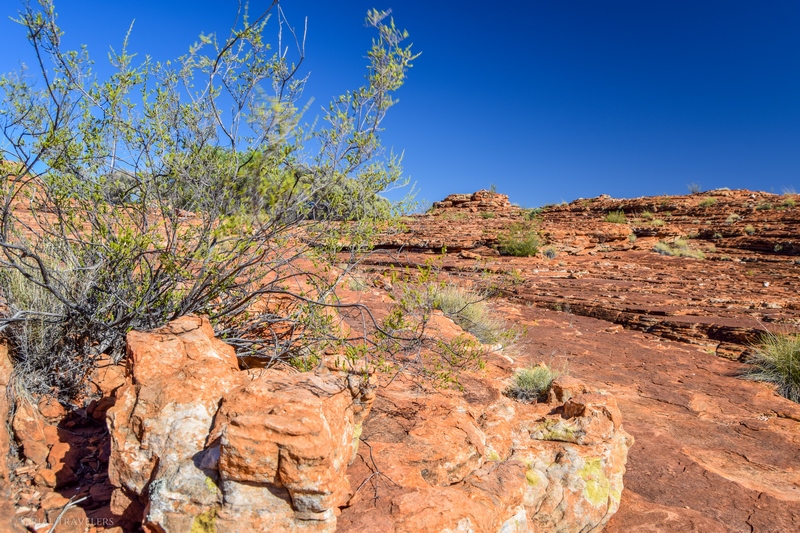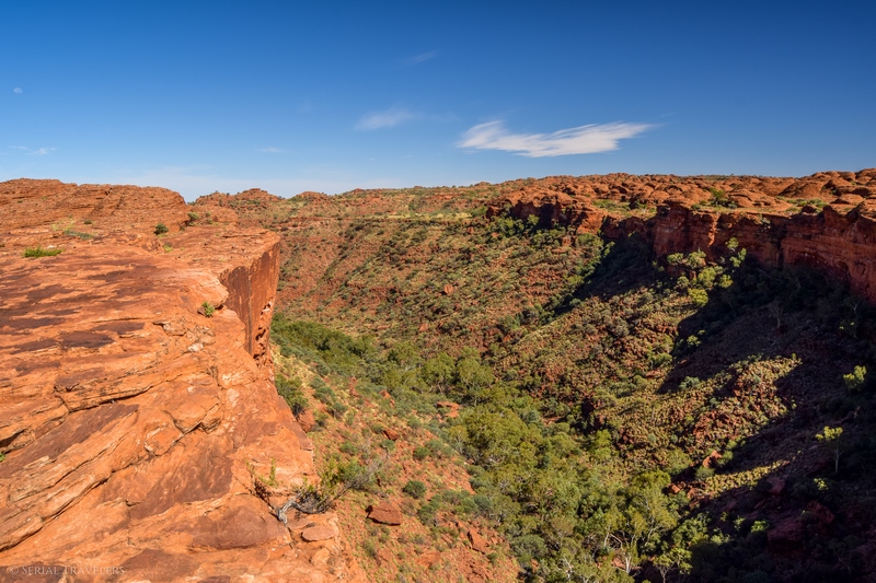 Ce court sentier permet d’atteindre le bord du canyon, pour faire de très belles photos. D’après nous, il s’agit sans aucun doute de l’un des meilleurs points de vue de la randonnée Kings Canyon Rim Walk 🙂 Le sentier a été nommé ainsi en l’honneur de Jack Cotterill, qui a aidé à la promotion du tourisme dans le Centre de l’Australie depuis les années 1950. Il fut le premier Australien d’origine européenne à avoir organisé des tours guidés jusqu’à Kings Canyon dans les années 1960 ! Ce même point de vue de Cotterills Lookout permet aussi d’apercevoir le Garden of Eden en contrebas, sur l’autre flanc du belvédère.