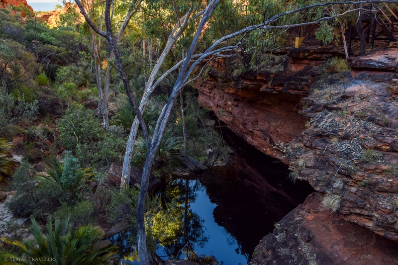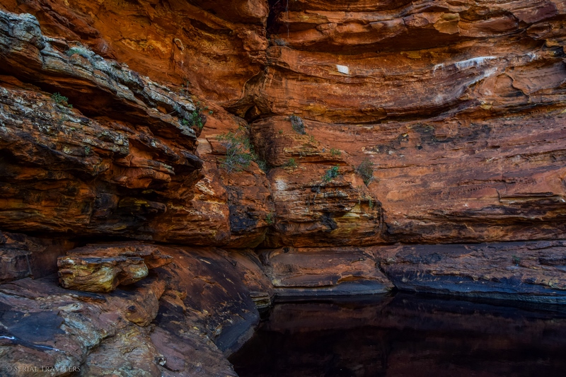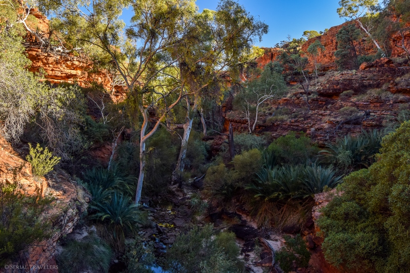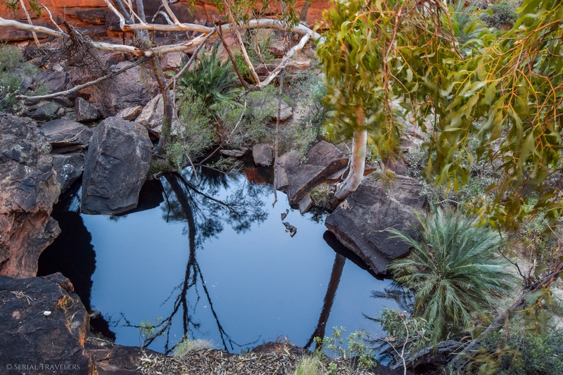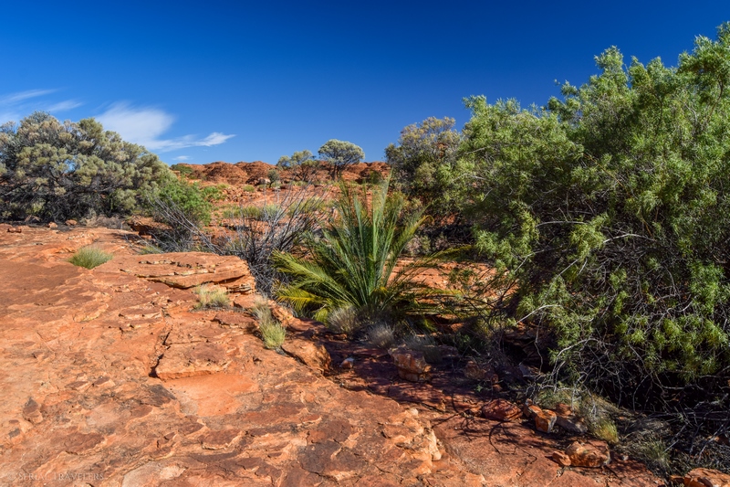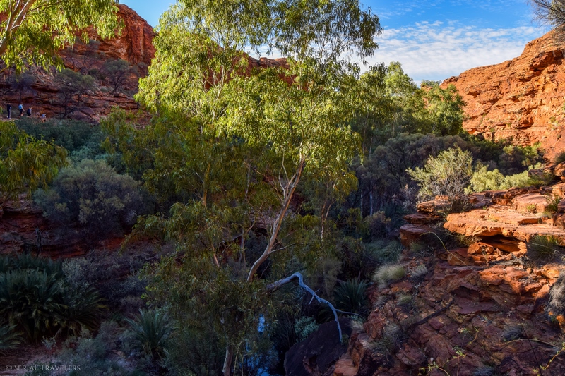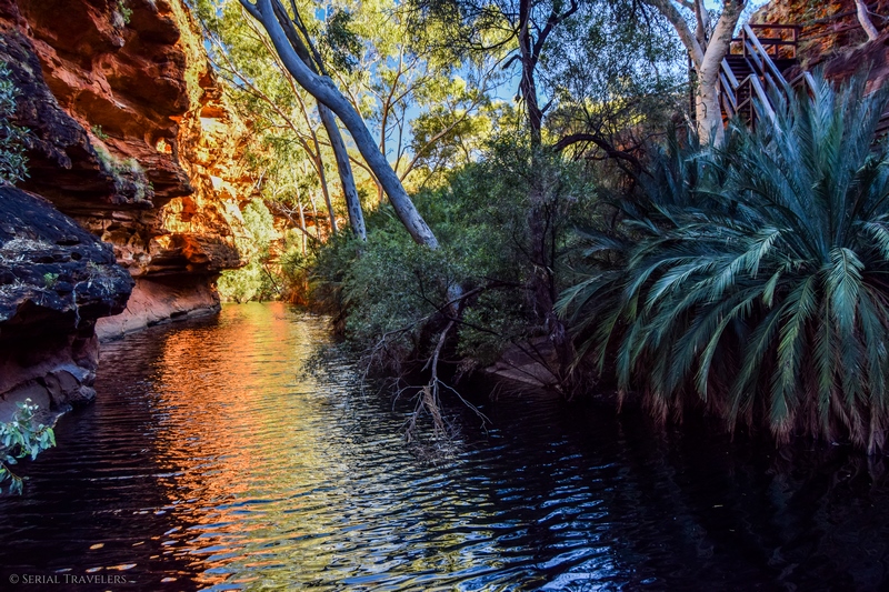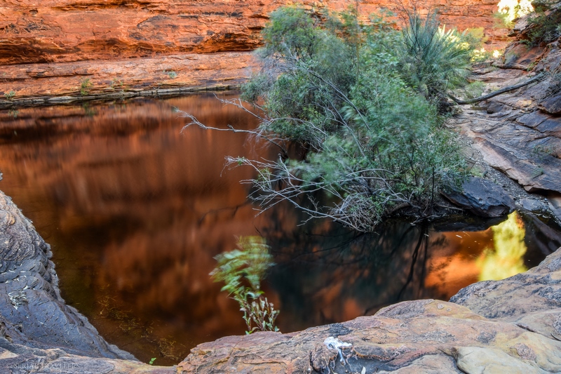 Pour atteindre le Garden of Eden, qui est le trou d’eau principal, il faut redescendre du plateau au fond de la gorge grâce à des escaliers en bois aménagés, et suivre la Kings Creek jusqu’au bout du sentier. Vous tomberez alors sur le clou de la visite de Kings Canyon, un énorme bassin d’eau claire, dans lequel on retrouve beaucoup de vie ! Prenant sa source au niveau de la rivière Kings Creek, le Garden of Eden est un véritable paradis et un refuge pour nombre d’animaux et de plantes. On y retrouve donc des grenouilles (Desert Tree Frogs), plusieurs espèces d’oiseaux mais aussi des Nardoo, des fougères poussant dans l’eau avec des feuilles en forme de Trèfle, flottant comme des nénuphars et même des serpents !