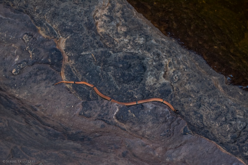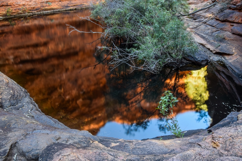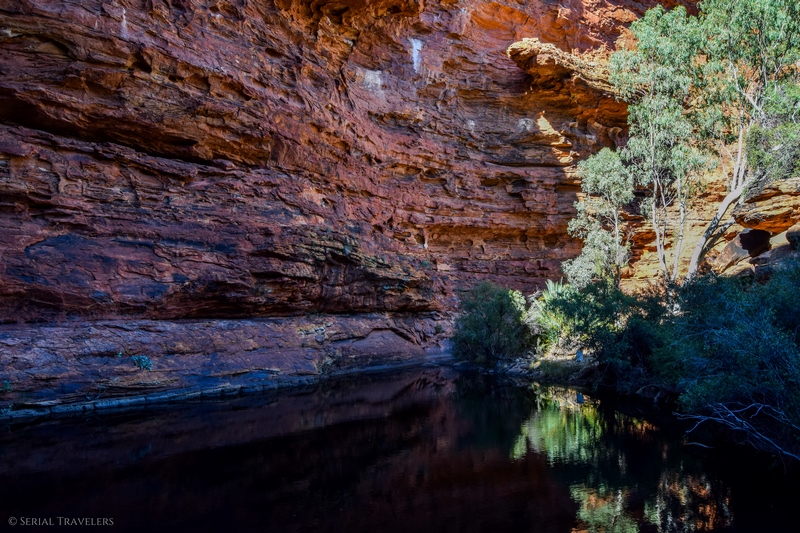 Dans le désert, les trous d’eau comme le billabong du Garden of Eden sont une importante source de vie pour les plantes, les animaux et les Hommes, en plus d’être sacrés pour les populations Aborigènes, propriétaires du lieu. Les propriétaires ancestraux du parc national de Watarrka demandent aux visiteurs de garder l’eau propre, pour la survie de toutes les formes de vie qui dépendent de ce trou d’eau. En conséquence, vous pouvez utiliser l’eau pour vous rafraîchir le visage, mais en aucun cas pour vous baigner dedans ! Les Aborigènes ont déjà bien assez souffert de la présence des Européens sur leurs Terres depuis 200 ans et il serait dommage de continuer à bafouer ce peuple en ignorant leurs consignes…