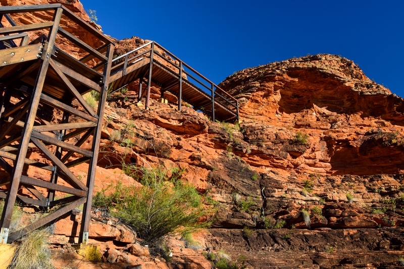 La première partie du sentier est sans aucun doute la partie la plus difficile de la randonnée et consiste à grimper sur une colline où des marches ont été creusées dans la roche ! Pour vous donner une idée de la difficulté, cette colline est très simplement surnommée « Heart Attack Hill » par les Australiens… Et elle porte bien son nom ! En effet, il vous faudra avaler le dénivelé de 270 m pendant 15 minutes très cardio, afin d’arriver jusqu’au sommet du canyon…