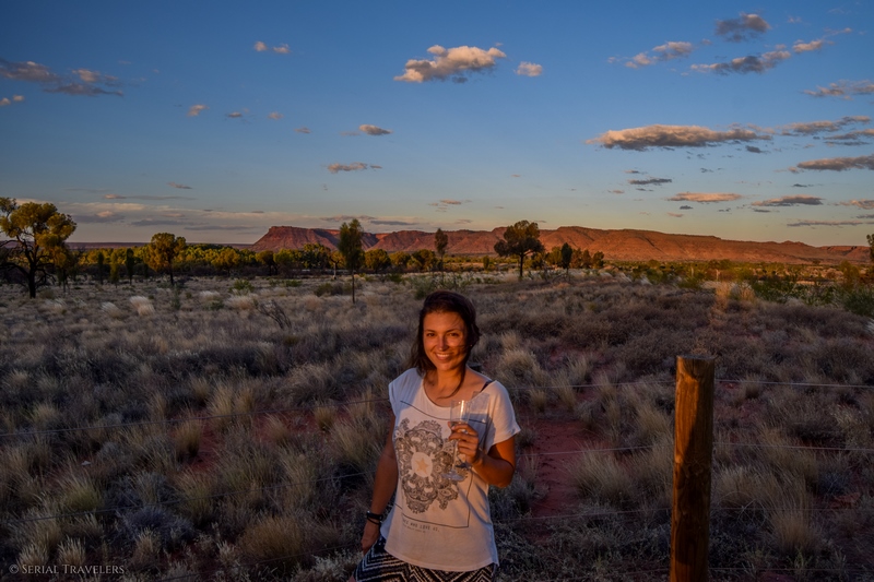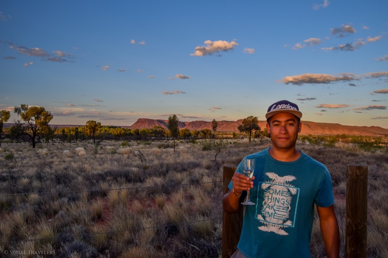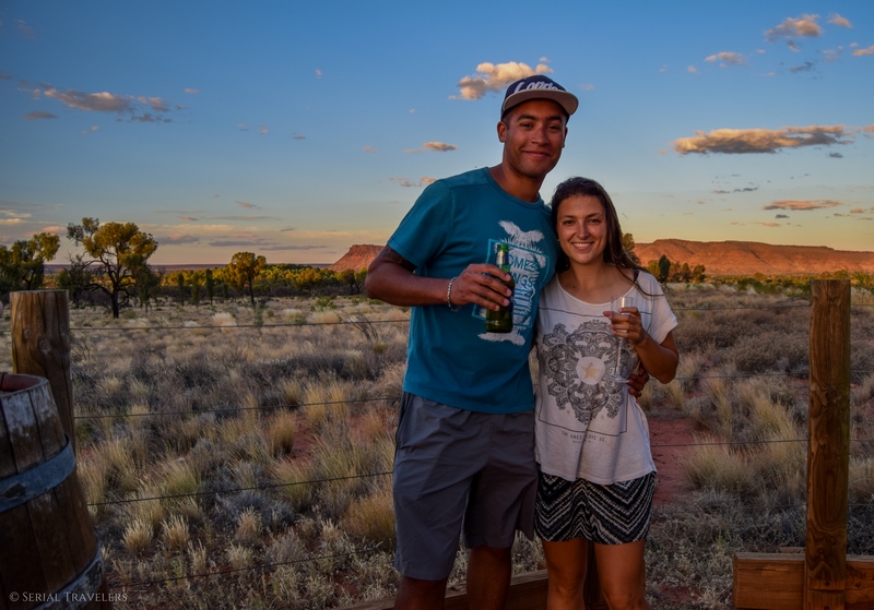 Nous rejoindrons ensuite à pied le Kings Canyon sunrise lookout vers 18H30. Et oui, le soleil se couche tôt dans le désert ! Ici a été aménagé une esplanade pour observer les couleurs descendantes du soleil sur la roche rouge du canyon, situé à moins d’une dizaine de kilomètres de là. Et, ce jour-là, la direction du complexe hôtelier offrira à tous les clients présents sur la plateforme un apéritif (champagne, bière et vin blanc) pour assister à ce premier coucher de soleil sur l’Outback et Kings Canyon. Nous avons en effet eu la chance d’être présents au moment où un spot publicitaire promotionnel était tourné sur le site 🙂