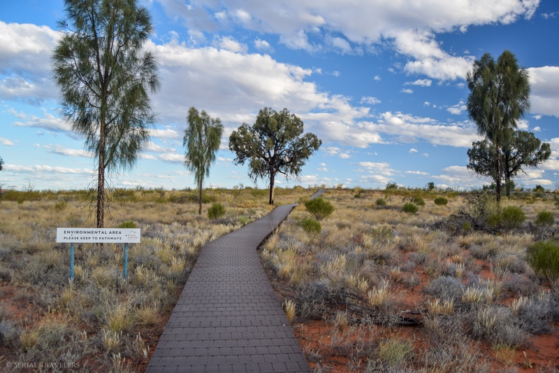 Après avoir chargé les backpacks en vitesse et fait un tour rapide de la voiture, nous prendrons finalement le volant dès 13H30, pour partir directement en direction de Kings Canyon. Enfin, ce n’est pas tout à fait vrai : avant de partir, nous ferons un détour par Yulara, au niveau de la seule supérette du coin à des kilomètres à la ronde ! Mais c’est quoi Yulara ? Et bien, c’est un village/complexe hôtelier monté de toute pièces pour les touristes se rendant à Uluru, à environ 25 km du monolithe. Désert oblige, nous achèterons un énorme pack d’eau, ainsi que des gâteaux et des nouilles instantanées… Les prix affichés ici sont déjà très élevés, mais au comptoir de location, on nous a prévenu que les prix étaient encore plus exorbitants à Kings Canyon !
