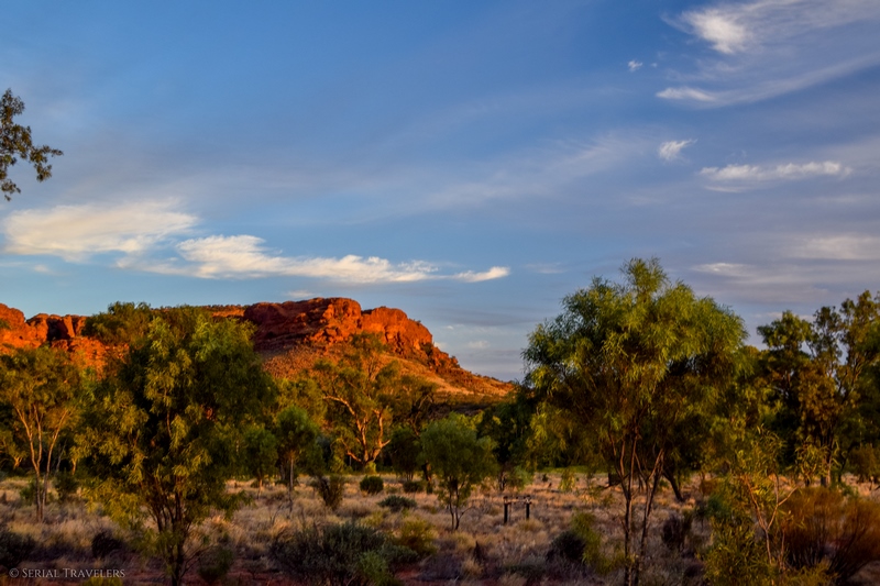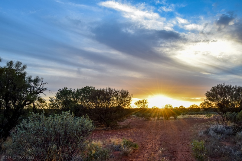 Nous passerons donc tout l’après-midi au resort à barboter dans la piscine attenante à notre bungalow, avant de filer de nouveau à proximité du canyon pour voir le coucher de soleil directement sur le canyon. Et coup de chance encore une fois, ce coucher de soleil sera tout à fait épique : des nuages mais pas trop, une belle lumière rasante et un soleil magnifique, comme seul l’Outback australien sait proposer à ses visiteurs… Le seul gros hic ici dans l’Outback, c’est bien la présence de mouches en grande quantité, qui adorent marcher sur nos visages !