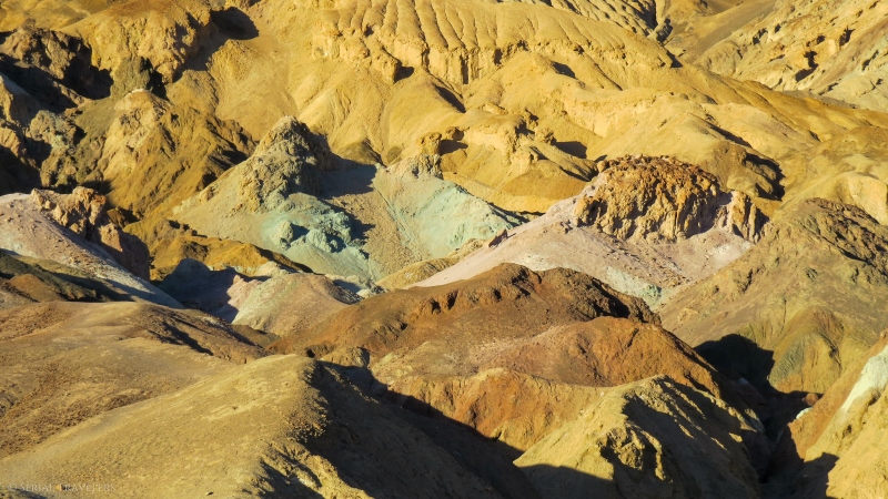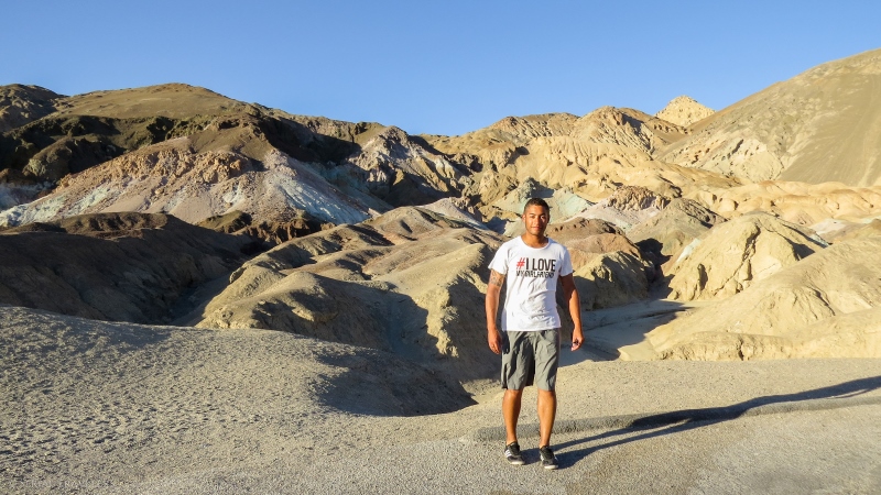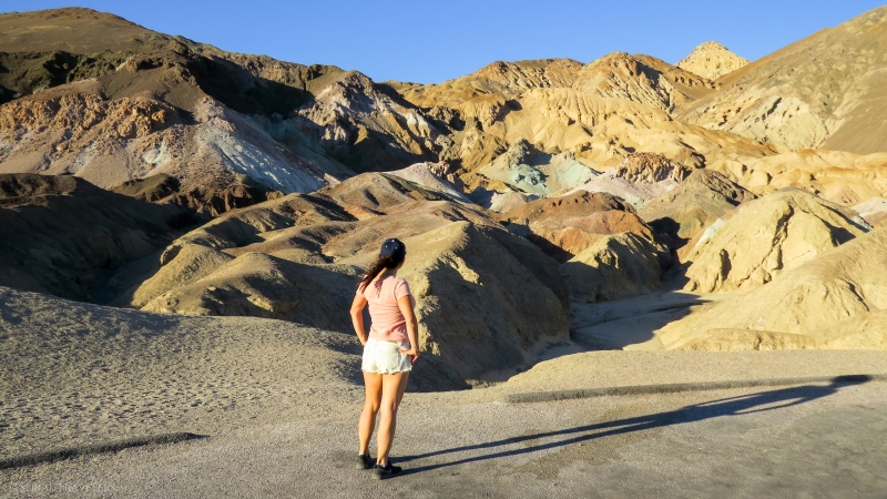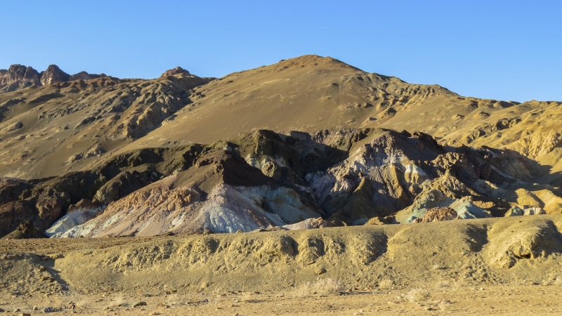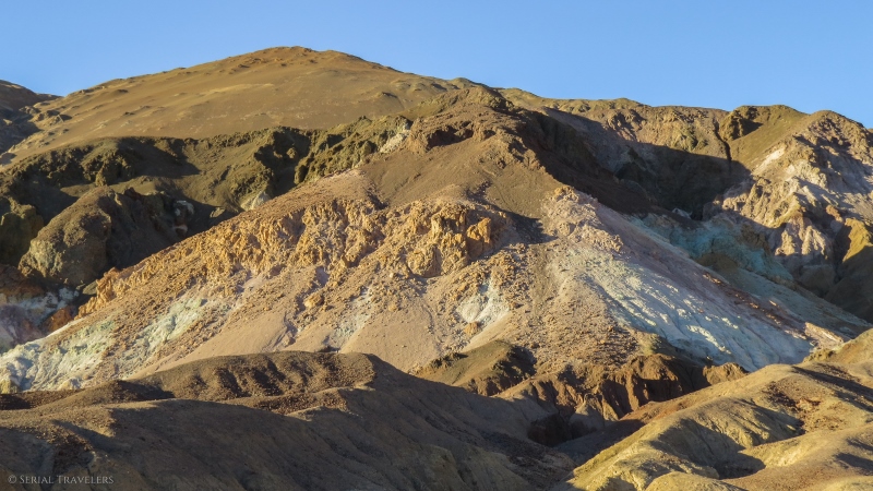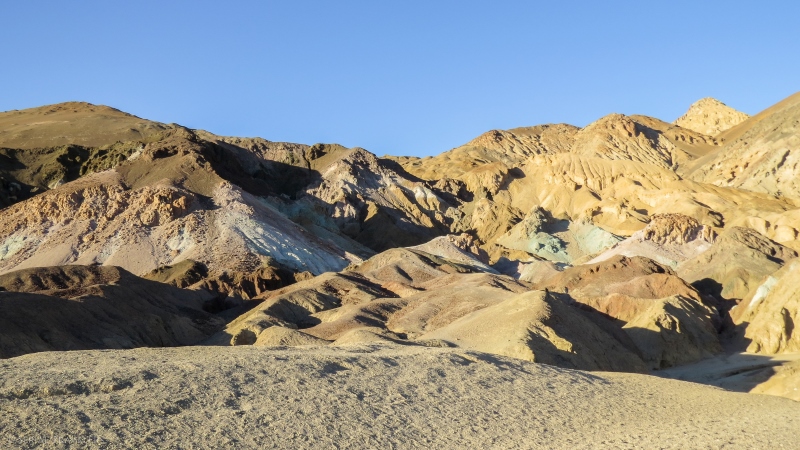 Après ce court interlude, nous atteignons l’Artist’s Drive vers 18H30. Cette piste accessible depuis la route principale menant à Badwater Basin, conduit à Artists Palette, l’un des bijoux du parc. C’est un panorama de roches multicolores (violettes, vertes ou roses) obtenu grâce à la présence de nombreux minéraux d’origine volcanique situés au cœur de la roche. Les couleurs y sont plus belles au soleil couchant (vers 20H), mais à 19H déjà, nous avons obtenu de très belles couleurs !