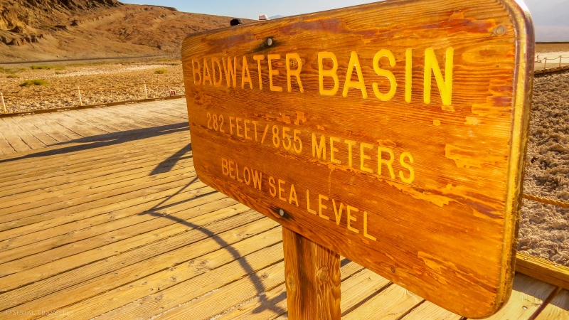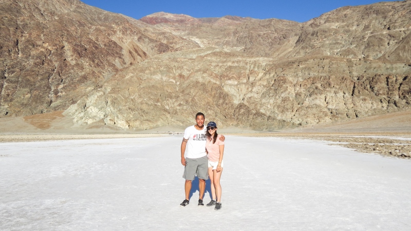 Peu après 17H, nous partons en direction de Badwater Basin, le point le plus bas d’Amérique du Nord (-85 m). Badwater Basin (« mauvaises eaux » en français) consiste en une immense étendue de sel, marquant la présence d’un ancien océan plusieurs millions d’années auparavant ! Un petit parking aménagé permet de se rendre sur l’étendue de sel, via un ponton en bois. En sortant de la voiture, une bouffée de chaleur étouffante nous tombe dessus, suivie de violentes bourrasques de vent !