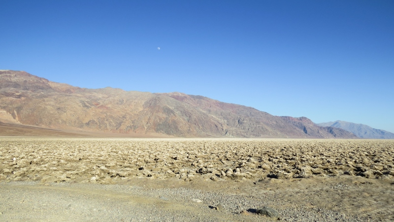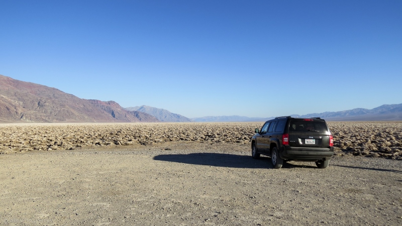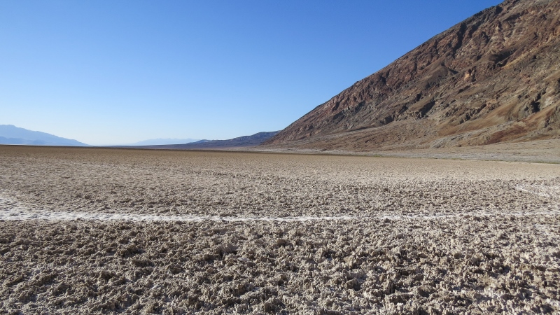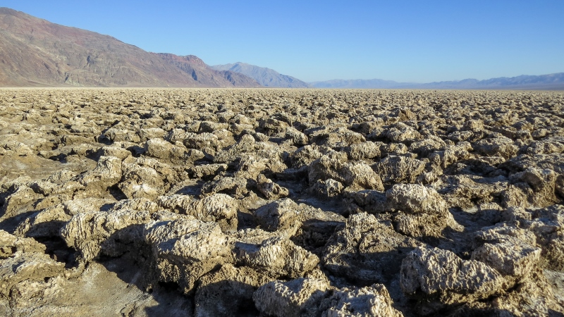 Initialement, nous avions prévu de faire une randonnée vers le Natural Bridge en repartant de Badwater Basin, mais la chaleur accablante finira de nous dissuader de réaliser ce trek. Nous passerons donc directement au point de vue suivant, qui n’est autre qu’une partie distincte du salar que nous venons de quitter. Le Devil’s Golf Course (littéralement, le terrain de golf du Diable) a la particularité de présenter le sel sous forme de concrétions extrêmement coupantes ! Une piste caillouteuse permet d’accéder au Devil’s Golf Course depuis la route principale menant à Badwater Basin. Néanmoins, Devil’s Golf Course n’est pas le panorama le plus dingue de Death Valley !