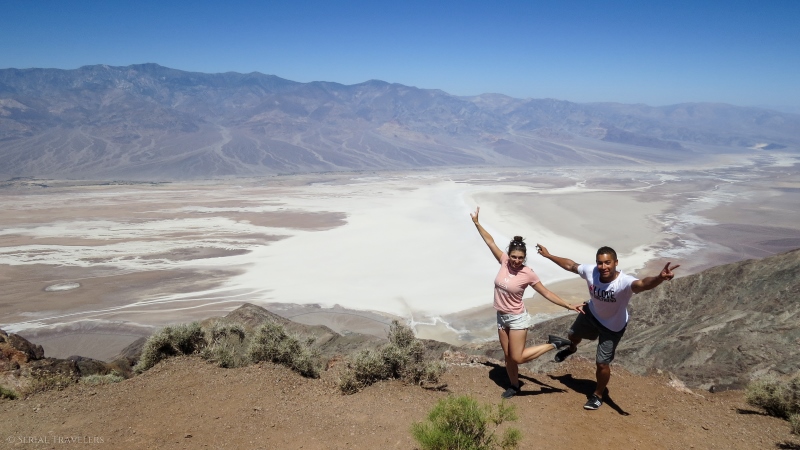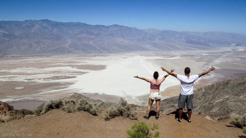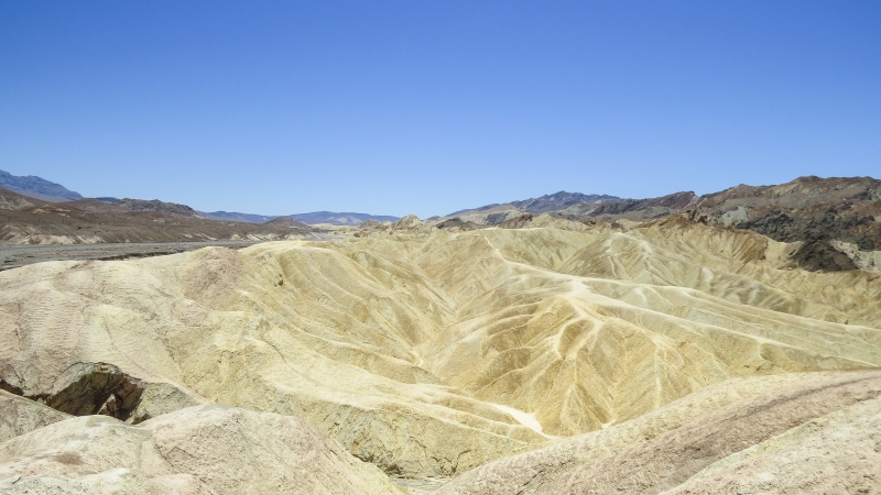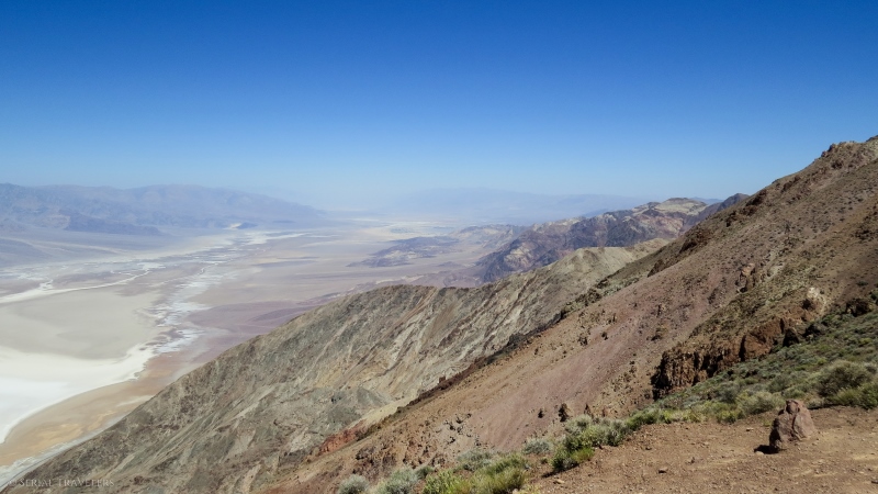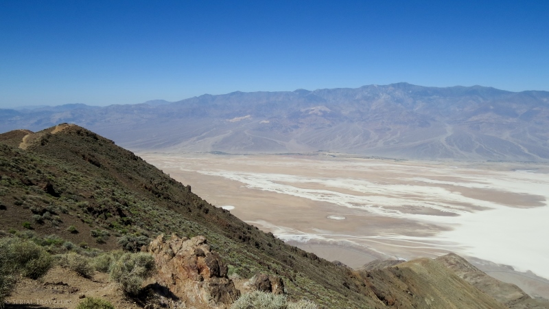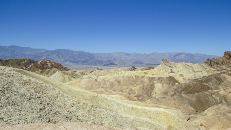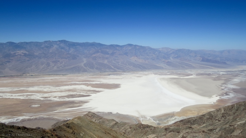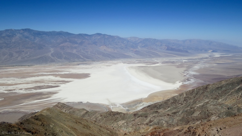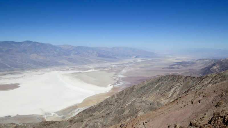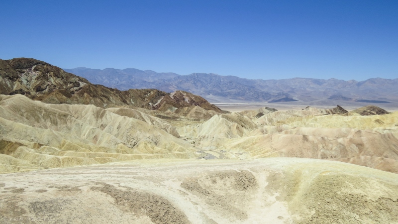Nous empruntons ainsi une route serpentant à travers des reliefs escarpés et grimpant à 1 669 mètres d’altitude avant d’atteindre Dante’s View, l’un des plus beaux points de vue du parc. Depuis le parking, un petit chemin de crête permet d’atteindre un promontoire plus élevé, mais la chaleur est déjà étouffante (et ce dès 11H du matin) et nous renoncerons à cette petite marche. Cependant, la vue est déjà superbe depuis le point de vue situé à proximité du parking. En contrebas, on domine Badwater basin et son océan de sel, déposé par un ancien lac présent il y a des milliers d’années.