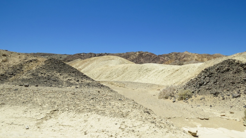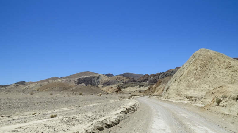 Nous partons ensuite en direction du Twenty Mule Team Canyon. Il s’agit d’une piste non goudronnée de 4,4 km à sens unique, serpentant dans un étroit corridor de dunes rocailleuses. Le nom du canyon fait référence aux mules qui étaient autrefois utilisées par la compagnie minière qui exploitait le borax dans la vallée (un composé chimique utilisé l’industrie du verre et des céramiques).