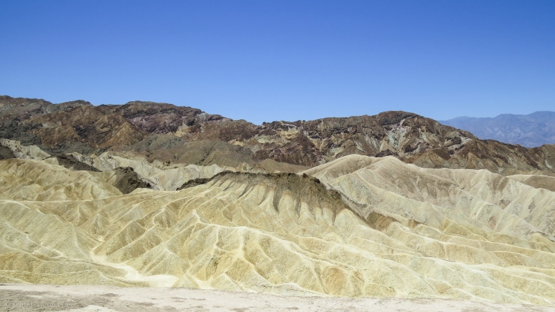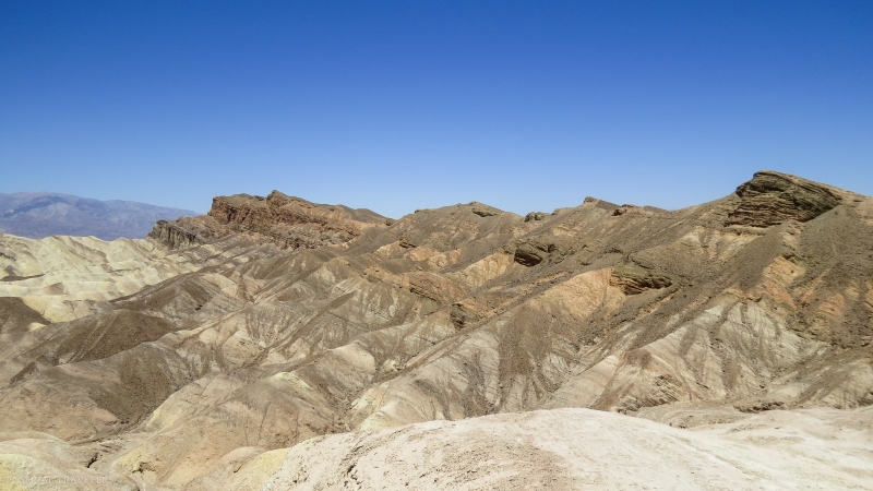 Suite à cette courte balade en voiture, nous arrivons au niveau du parking de Zabriskie Point aux environs de midi. Ce viewpoint fut nommé en l’honneur de Christian Brevoort Zabriskie, vice-président de la Pacific Coast Borax Company. Zabriskie Point offre très certainement la plus belle perspective du parc ! Une formation géologique particulière, Manly Beacon, est particulièrement remarquable ! Ici, on dirait que la roche marbrée a été plissée négligemment comme une nappe que l’on aurait oublié sur un coin de table 🙂