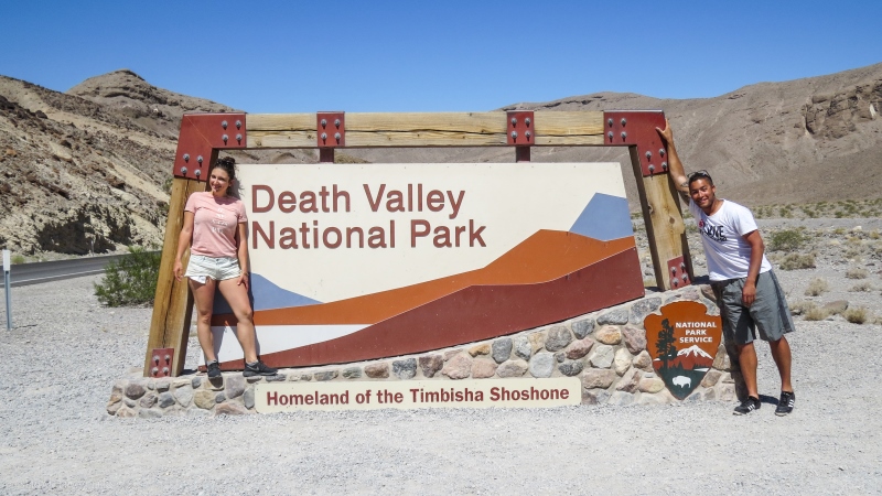 Nous arrivons dans le parc aux environs de 10H30 par l’entrée Est, après Death Valley Junction. Après notre traditionnelle photo devant le panneau d’entrée du parc, nous nous dirigeons vers Dante’s View, le point d’intérêt le plus au Sud du parc. Concernant l’utilisation de la voiture dans la Vallée de la Mort, il ne faut surtout pas négliger l’entretien et les contrôles de base ! Auquel cas, le moteur risque tout simplement de surchauffer et de casser… Et avec cette chaleur épouvantable, il ne fait pas bon être sans voiture à Death Valley. Dans la même veine, mieux vaut ne pas utiliser la climatisation dans la voiture lorsque l’on circule dans la Vallée de la Mort, toujours dans l’idée de soulager le moteur !