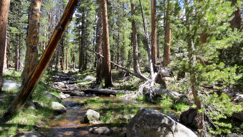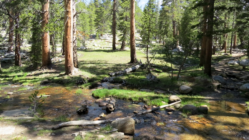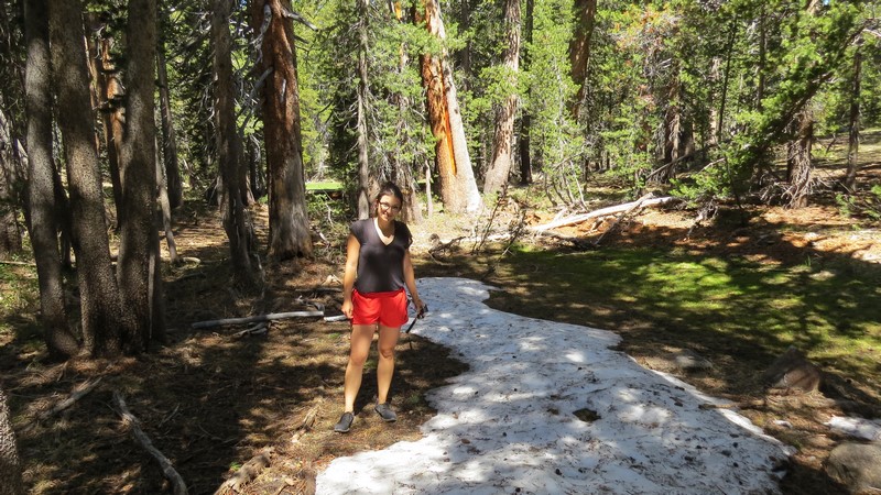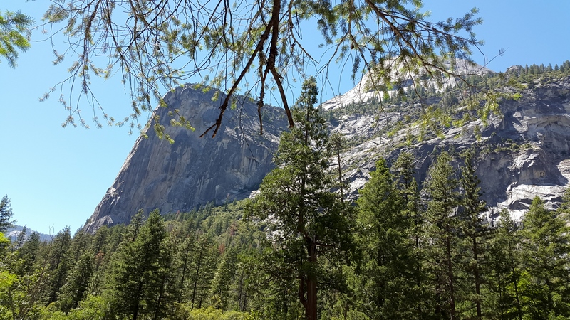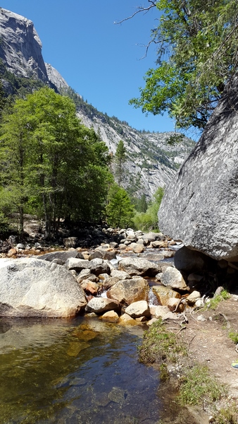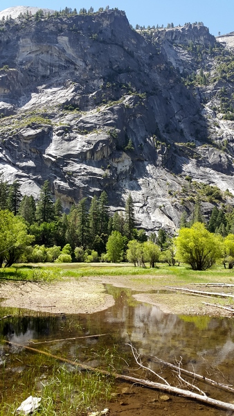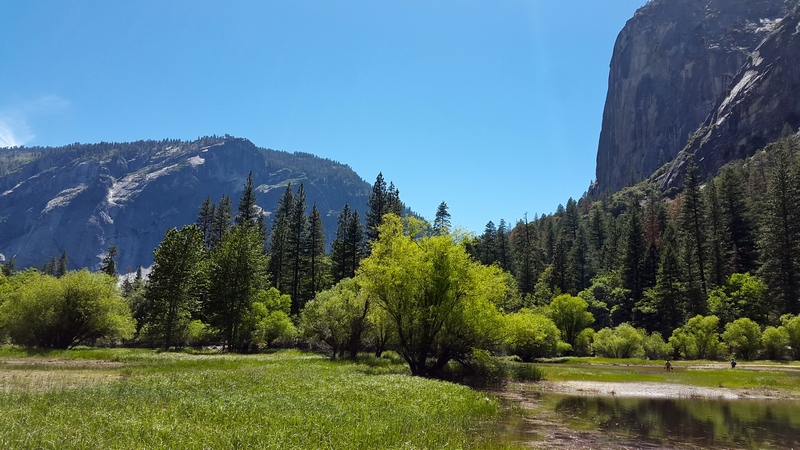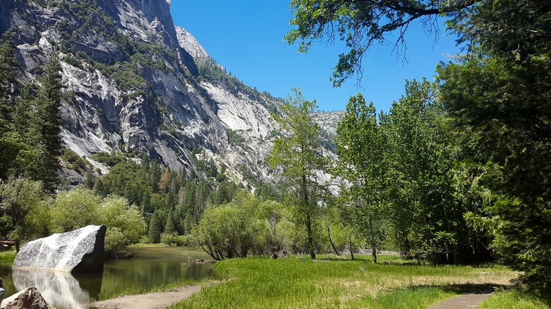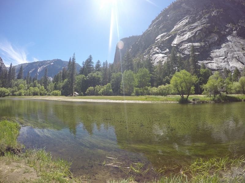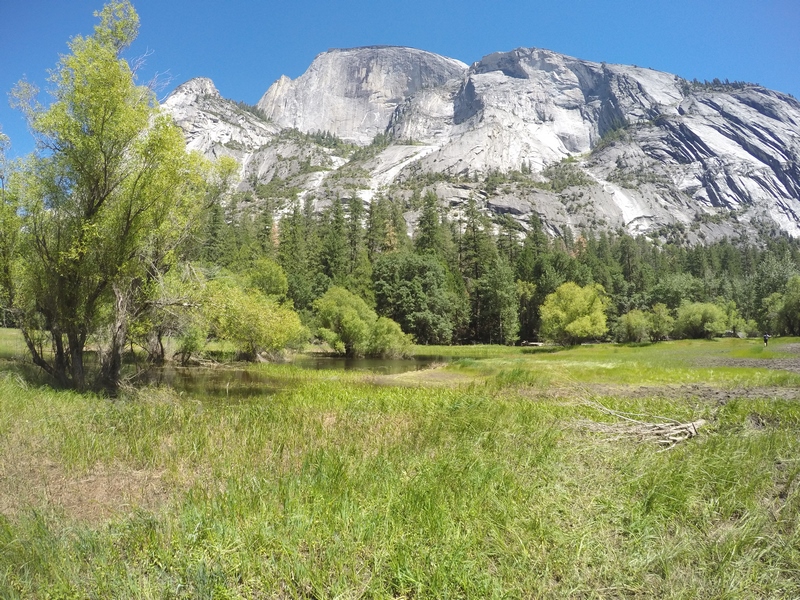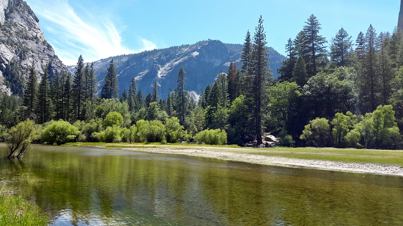 Après cette rencontre totalement improbable, nous avons effectué la dernière randonnée de la journée menant au Mirror Lake, en démarrant depuis l’arrêt n°16 : Happy Isles vers 14H30. Il s’agit d’un sentier plutôt plat de 3 km A/R, longeant la rivière Tenaka Creek et s’enfonçant par endroit dans les bois : la fin du sentier mène au fameux lac. Le lac est normalement censé donner un effet miroir en reflétant les reliefs alentours. Seulement, à cette époque de l’année (plein été), les précipitations n’ont sans doute pas été suffisantes, car nous n’avons trouvé rien de plus qu’une grosse mare, peu profonde, et n’offrant donc aucun reflet…