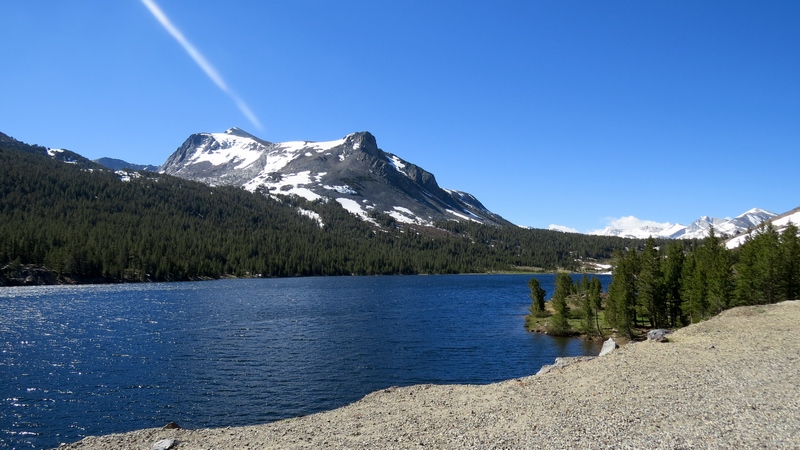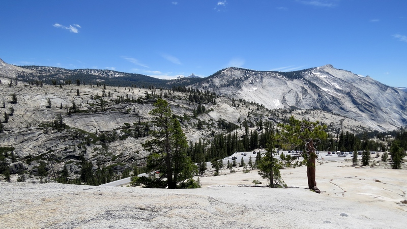 Vers 12H45, nous reprenons la voiture que nous avions garé au Tuolumne Meadows Visitor Center, pour manger au sommet d’Olmsted Point, l’un des plus beaux points de vue du parc. Sur la route, de nombreux parkings sont aménagés autour des points d’intérêt comme Tenaya Lake.