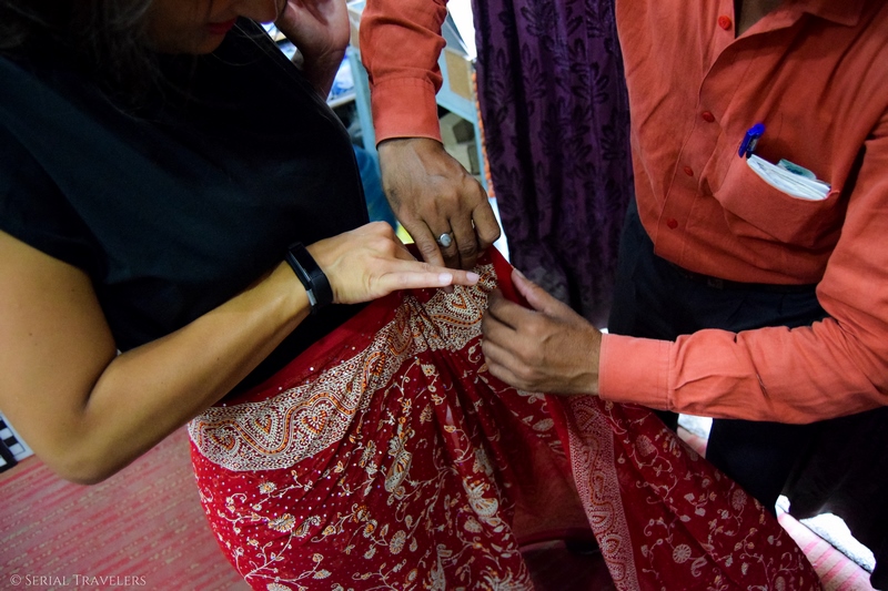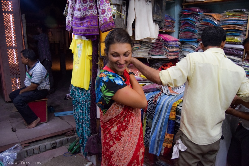 La nuit tombée, nous filons ensuite acheter des tenues traditionnelles pour se faire beaux le lendemain : une tunique indienne d’inspiration musulmane pour Thomas et un sari pour Laura. Cette longue pièce d’étoffe mesure environ 1m20 de large pour 6 mètres de long… Inutile de vous préciser que l’habillage a été épique ! Heureusement, le vendeur a été plus patient que Laura et cela a donné un résultat au-delà de nos espérances 🙂