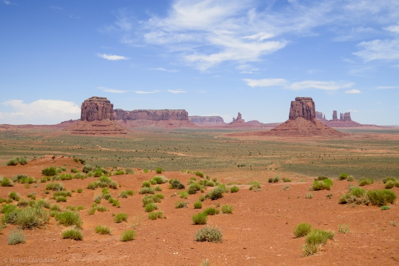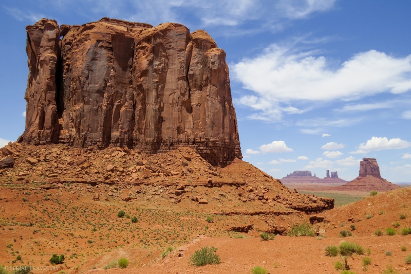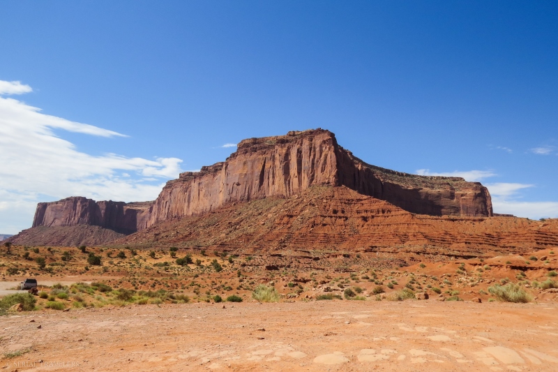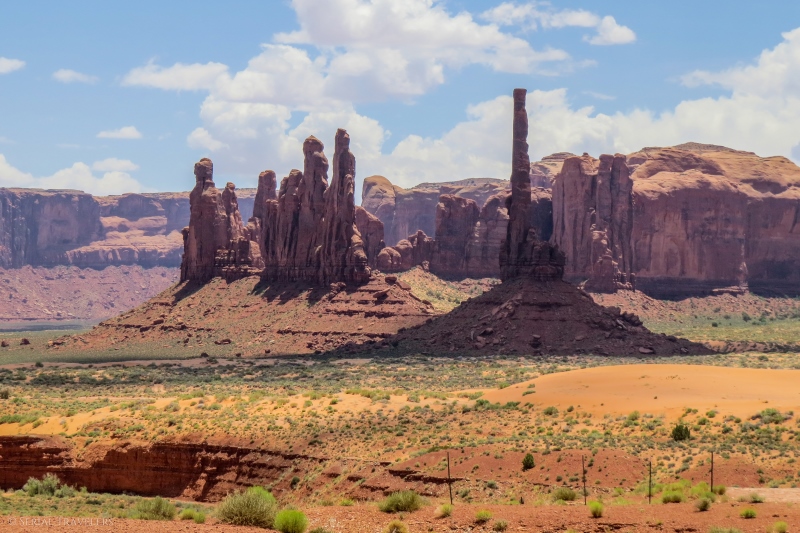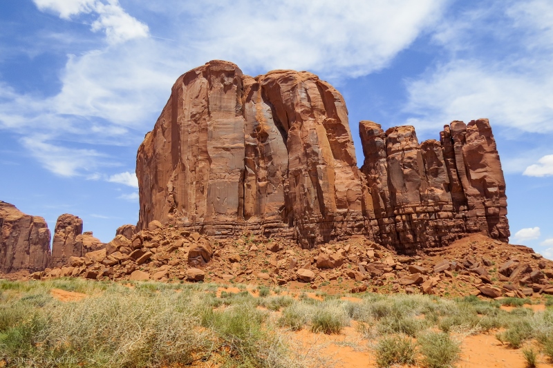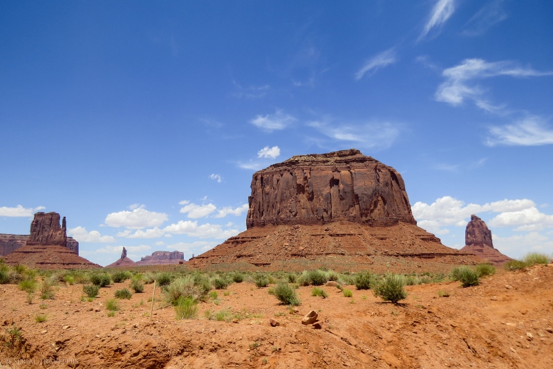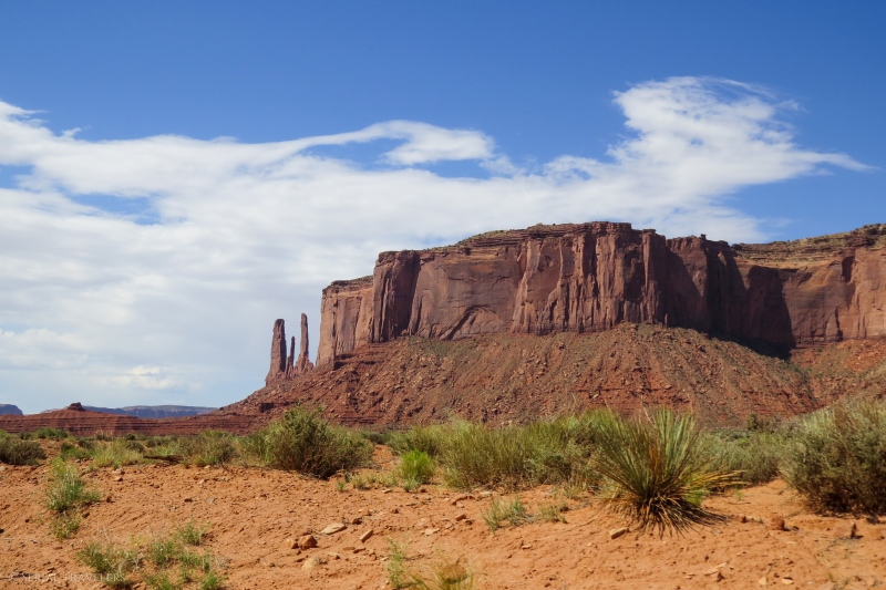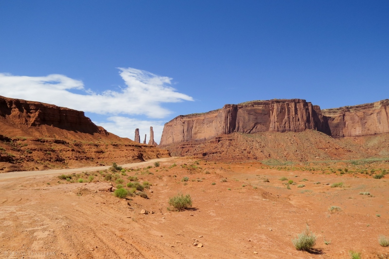 Au début de la Valley Drive, on tombe nez-à-nez avec Mitchell mesa, les buttes d’East Mitten, West Mitten et Merrick, les formations les plus emblématiques du parc ! Mitchell et Merrick tirent leur nom d’Ernest Mitchell et James Merrick, deux explorateurs Américains à la recherche de métaux précieux qui furent tués par les Utes. En se rendant vers le corral et John Ford’s Point, on aperçoit au loin la formation des Three Sisters, 3 pylônes de grès posés côte-à-côte.