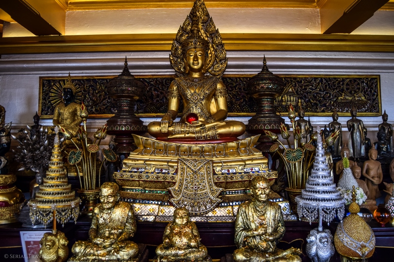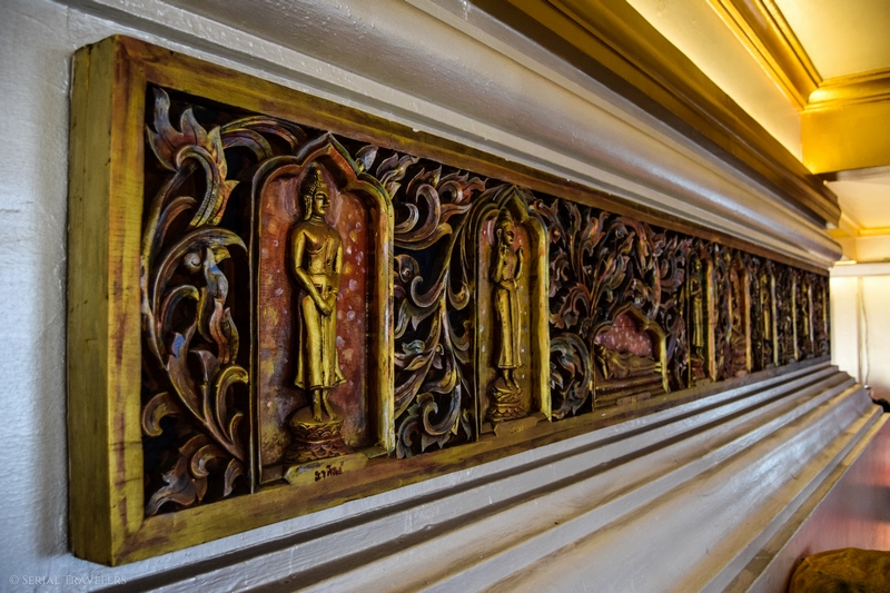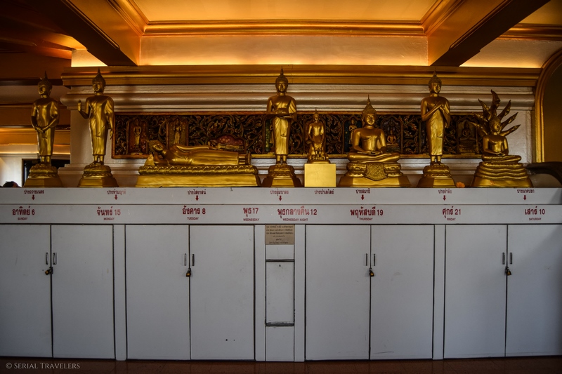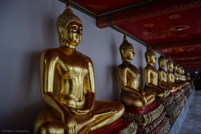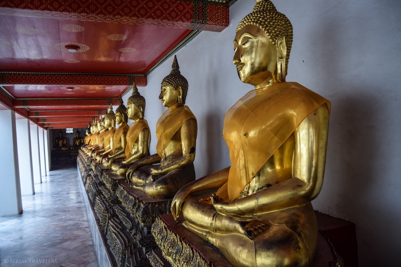 Des centaines de Bouddha assis et drapés de jaune sont alignés dans plusieurs parties du temple. C’est superbe et nous rappelle le temple Wat Yai Chai Mongkhon à Ayutthaya.